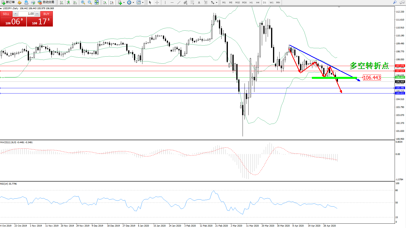 交易策略:106.443下方看跌,目标105.496105.022