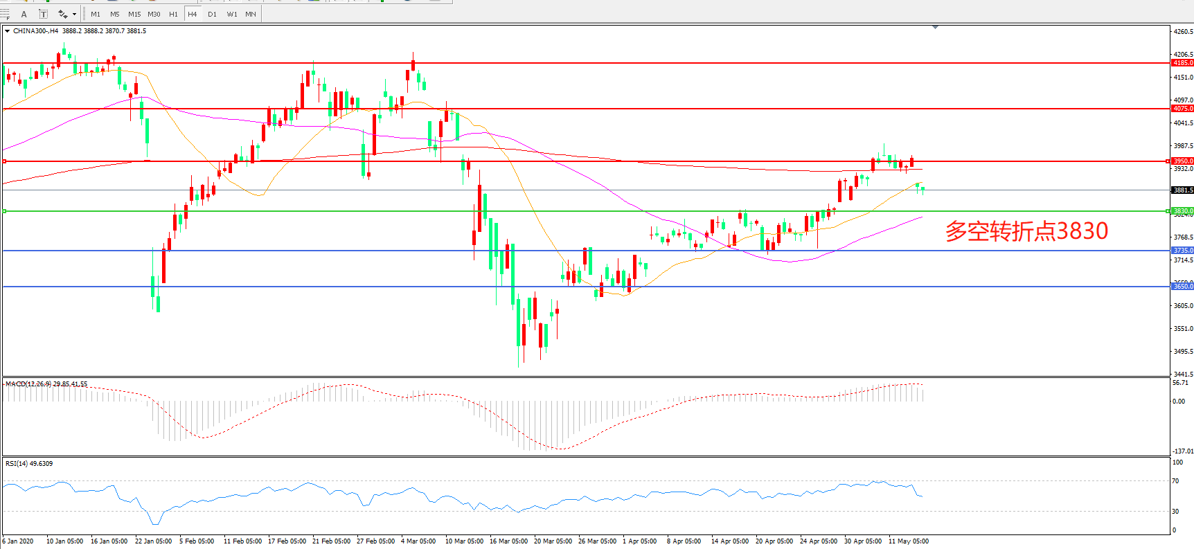4小时图看,沪深300低开低走,短期升势被破坏,200周期均线再次被跌破, MACD红柱减少,RSI指标走平,日内延续震荡概率较大。