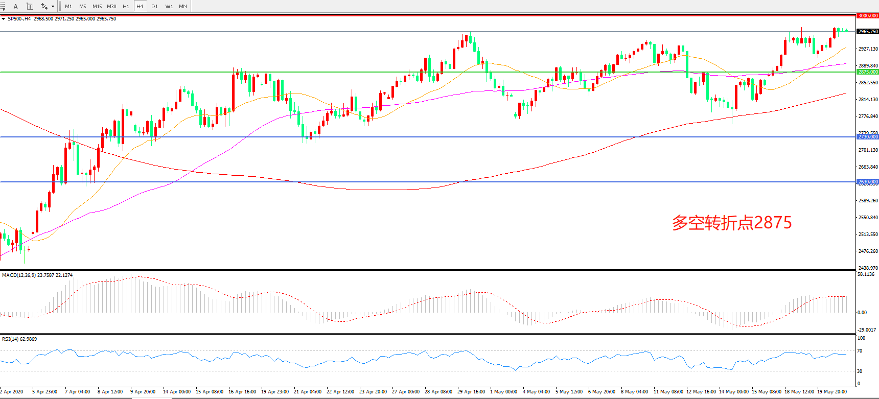 周二(5月20日),复工带来经济复苏的希望,科技股强劲上涨加之油价走高推升市场风险情绪,标普500震荡上行,收报2967点。目前标普500指数已较3月23日的收盘低点已经上涨了近33%,而由于未来几周的经济数据可能会令人沮丧,股市有短期“超买”风险。