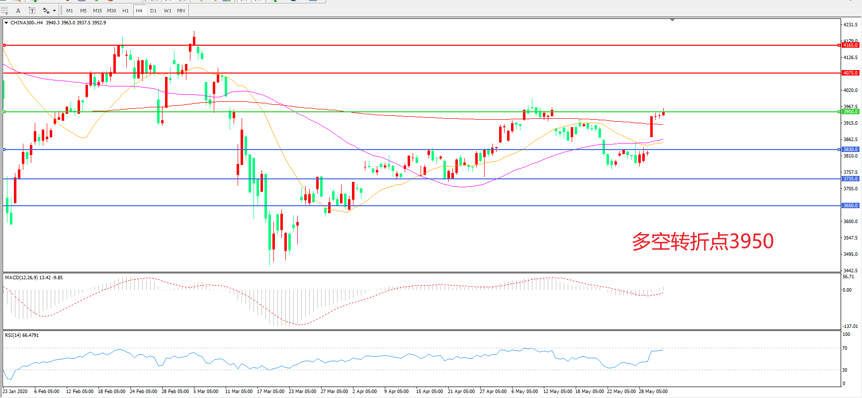 4小时图看,沪深300延续震荡上行,3950为前期整理高点,也是本轮反弹的第一个“拦路虎”,均线系统走平,形成支撑,MACD红柱增加,RSI指标走平,日内延续上行概率较大。
