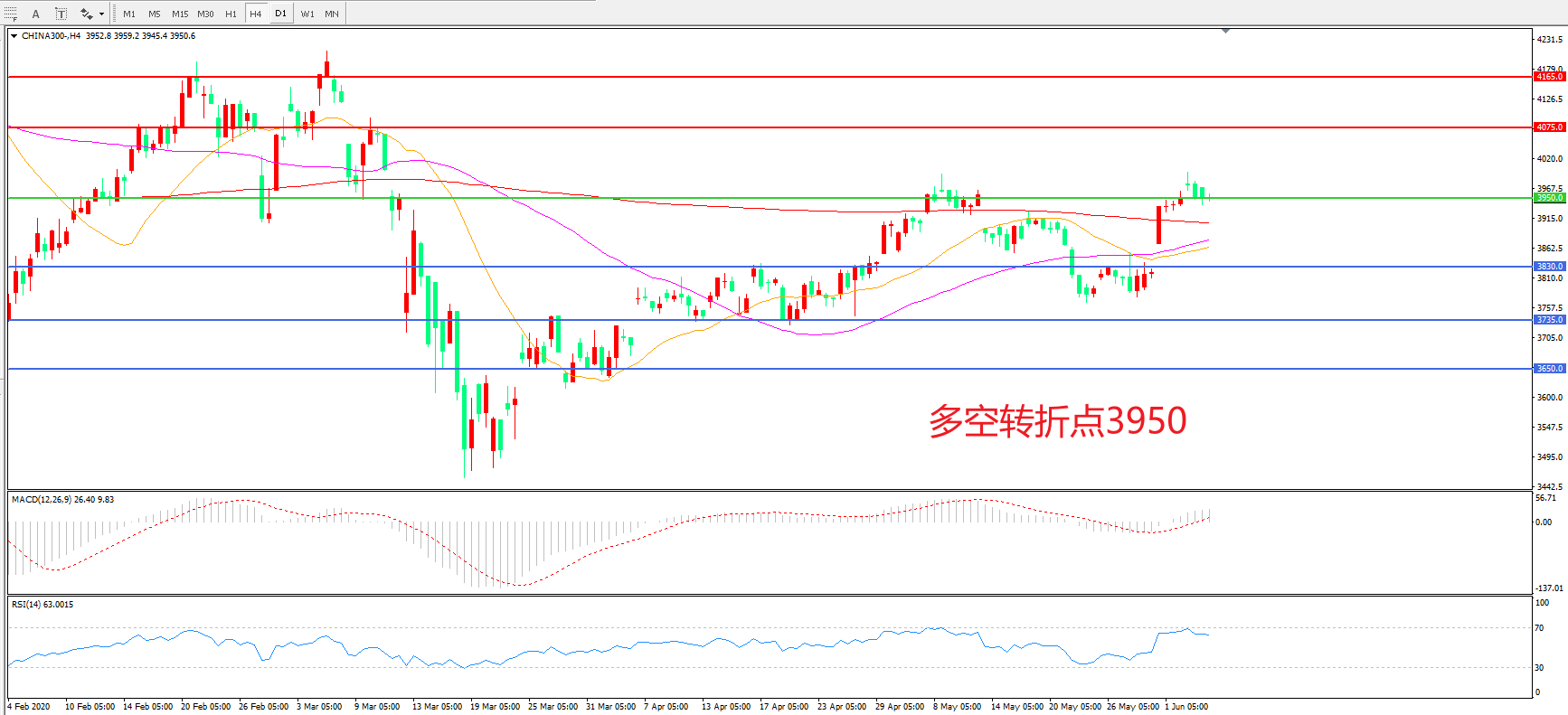 4小时图看,沪深300延续高位震荡,多空博弈胶着,3950成为短期多空分水岭,均线系统走平, MACD红柱增加,RSI指标走平,日内延续上行概率较大。