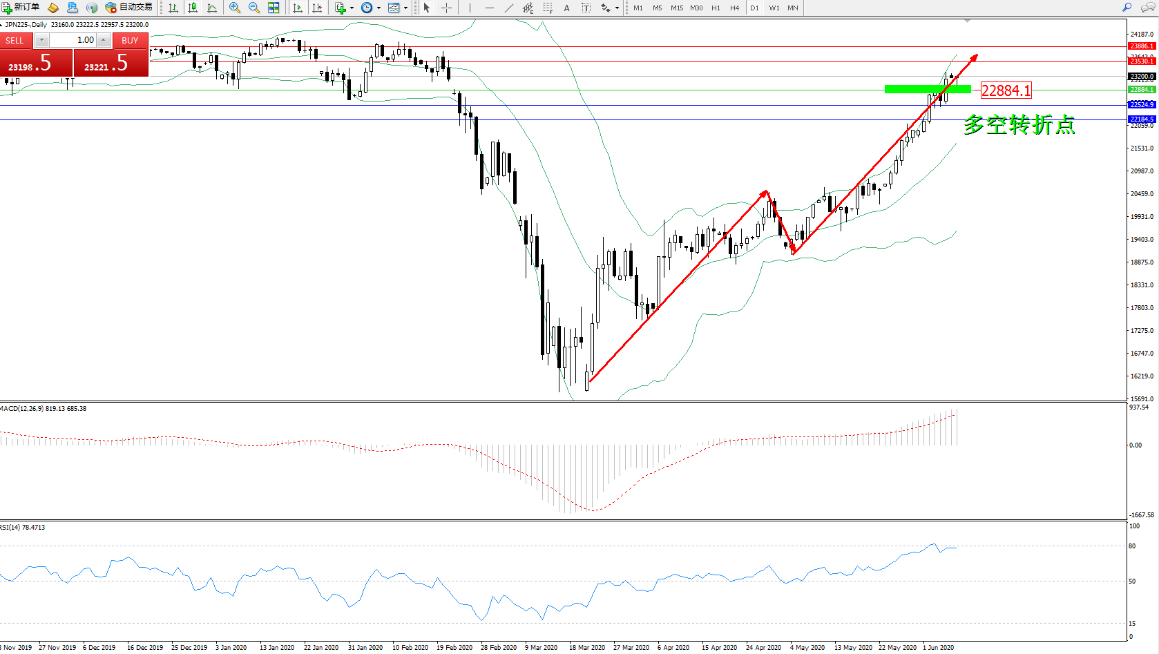 日经225指数6月8日(周一)收盘上涨286.77点,涨幅1.25%,报23150.50点。日本财务大臣麻生太郎表示,当前日本政府并没有考虑过下调消费税税率,这进一步挫败市场乐观情绪,应对第二或第三轮疫情需要至少5万亿日元的应对措施;股票市场的强势及美债收益率的反弹,日本经济第一季萎缩幅度少于初值,但新冠危机的整体影响仍料将令日本陷入更深的衰退。近期一连串4月数据,包括出口、工厂产出及就业数据均表明日本当前季度正面临战后最严重衰退,因疫情迫使全球民众待在家中及企业关闭。日本为全球第三大经济体,1-3月GDP经修正后环比年率为萎缩2.2%,初值为萎缩3.4%,市场预估中值为下滑2.1%。
