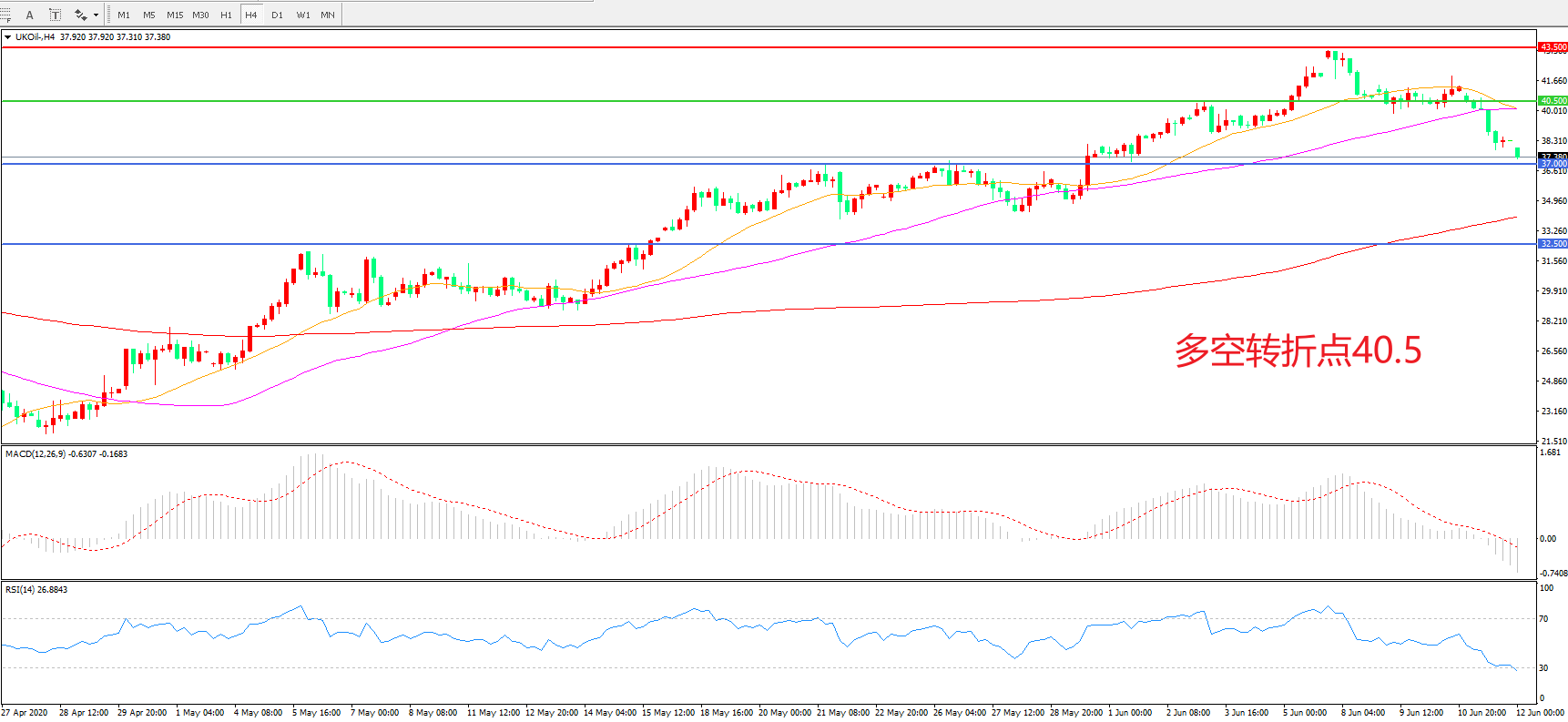 交易策略: 在40.50之下看跌,目标37.00      32.50