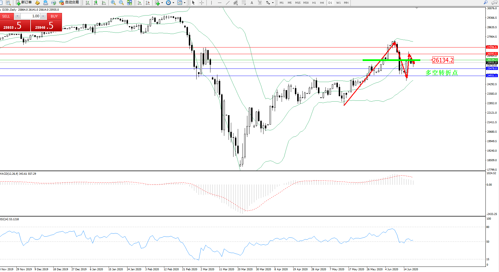 道琼斯指数618日(周四)收盘下跌39.50点,跌幅0.15%,报26080.10点。美国股市周四大部分时间窄幅波动,能源股、必需消费股和科技股领涨,投资者评估最新经济数据以及疫情发展。经济、政治、业绩和疫情各方面交叉影响市场,所有一切都存在不确定性。桥水基金警告,美国企业利润率多年强劲增长势头的逆转可能导致股票投资者遭遇“失去的十年”。美元周四创一周最大涨幅,因美国首次申请失业救济人数连续第13周突破100万人,反映了刺激经济面临的挑战之艰巨,对美国疫情再度抬头的担忧也支撑了美元.