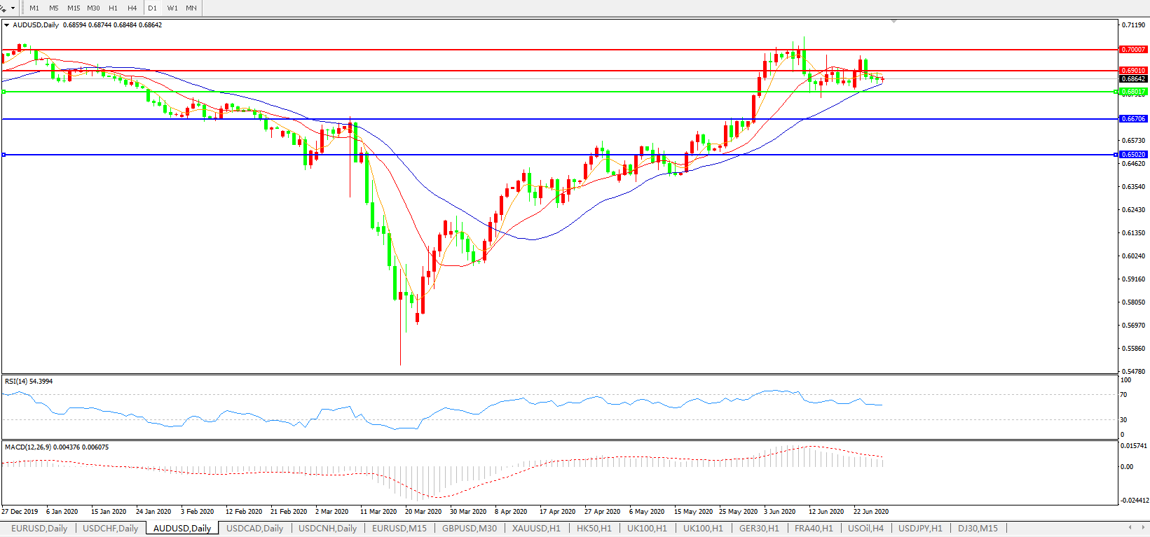 技术面简析:日图短期均线高位粘合走弱,汇价窄幅整理缺乏动能,MACD运行于0轴上方且量能持续缩量,RSI再度小幅走低,预计汇价短线大概率将继续整理,关注0.6800关口支撑。