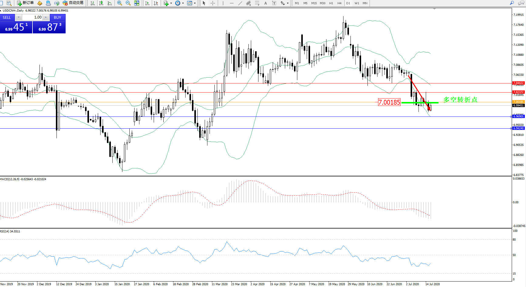 交易策略:7.00185下方看跌,目标6.96905、6.94240