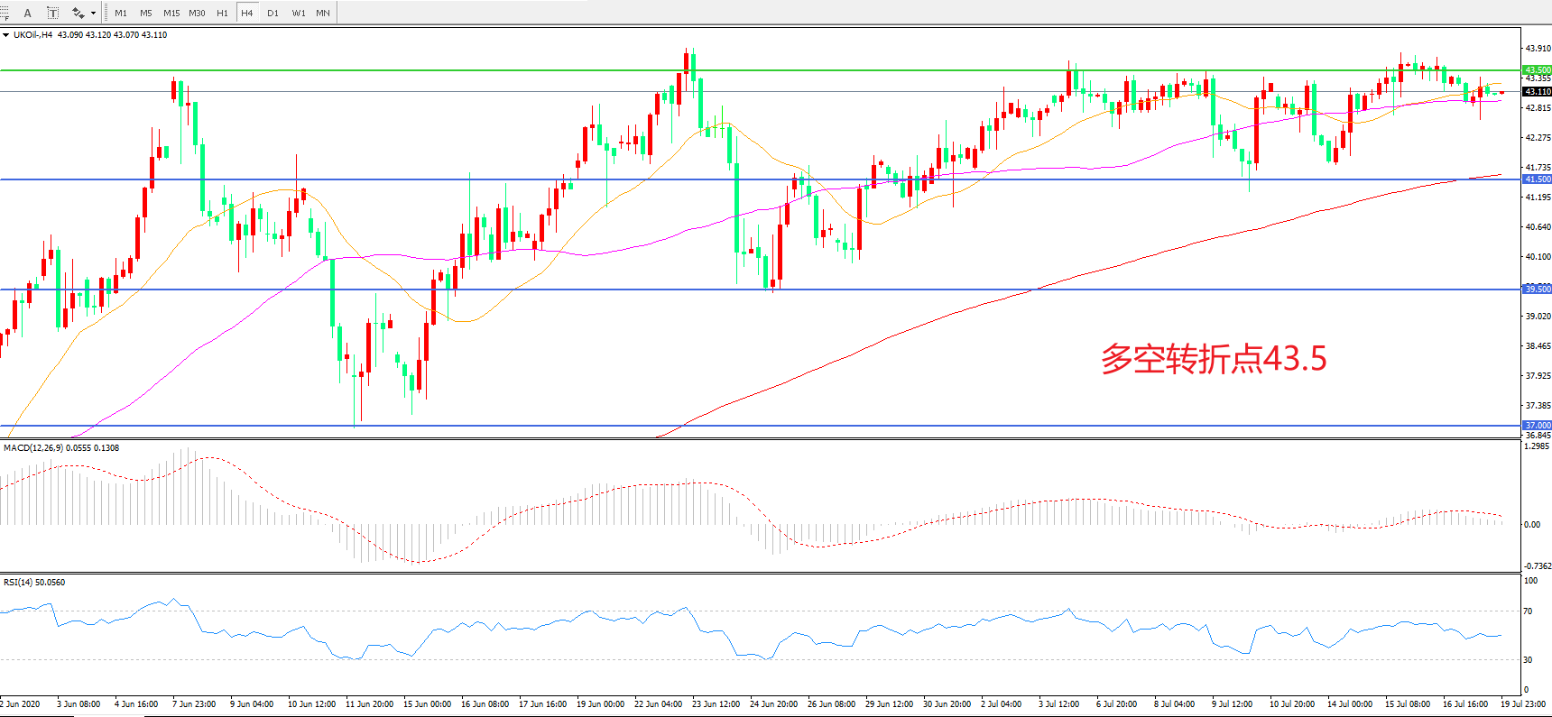 4小时图看,油价延续高位震荡,43.5美元成为短期争夺焦点,均线系统走平,MACD红柱增加,RSI指标走平,日内延续上行概率较大。