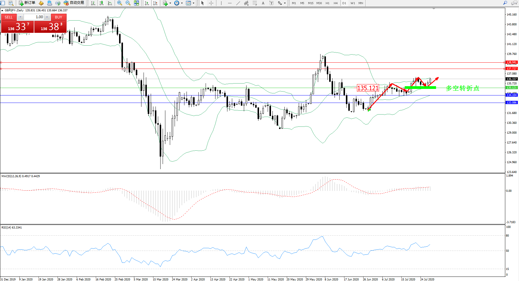 交易策略:135.121上方看涨,目标137.727、138.581
