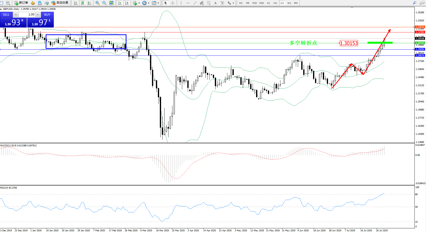 交易策略:1.30153上方看涨,目标1.31990、1.32810