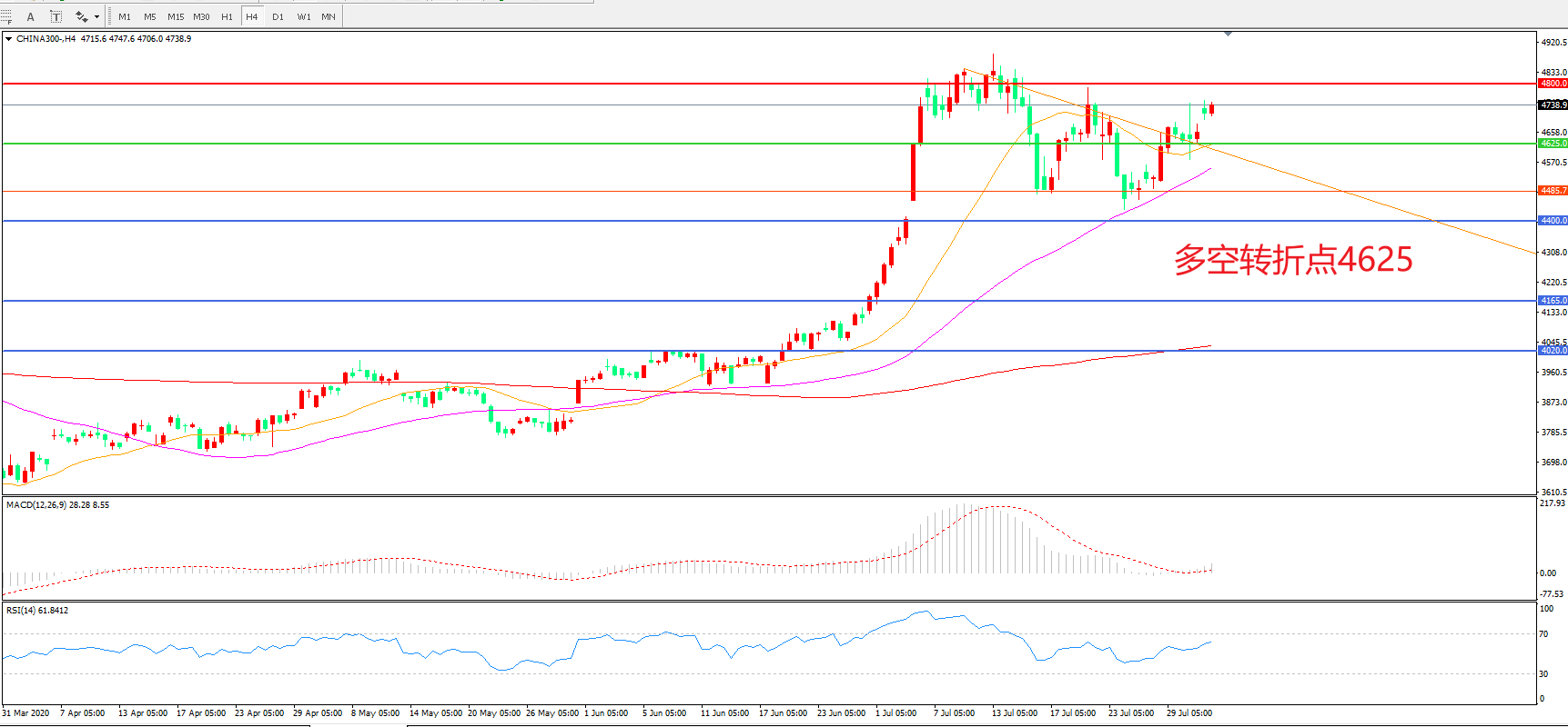 4小时图看,沪深300高开高走,三角形整理突破后,短期走势偏强,4800成为上方阻力,均线系统拐头向上, MACD红柱缩短,RSI指标走平,日内延续上行概率较大。