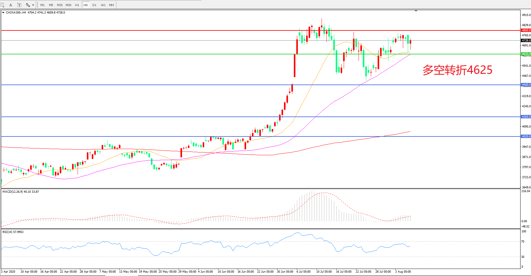 4小时图看,沪深300延续高位震荡,21周期均线成为短期支撑,4800成为上方阻力,均线系统拐头向上, MACD红柱缩短,RSI指标走平,日内延续震荡概率较大。