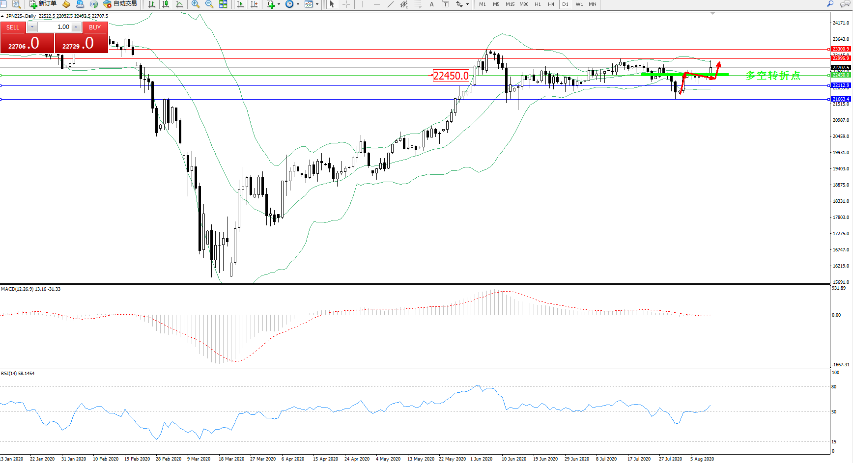 日经225指数8月11日(周二)收盘上涨403.06点,涨幅1.81%,报22733.00点。市场避险需求降温,同时亚洲股市悉数走强,投资者再度押注全球疫情此后将转向缓和,并进而看多经济前景,并对此前一度引发焦虑的地缘风险问题持看淡态度,美元守住隔夜涨幅,投资者等待美国刺激方案谈判;与市场对价值1万亿至1.5万亿美元刺激方案的预期相比,已宣布措施的经济提振作用显然更小。看市场的反应,投资者似乎认为最终会达成某种协议。