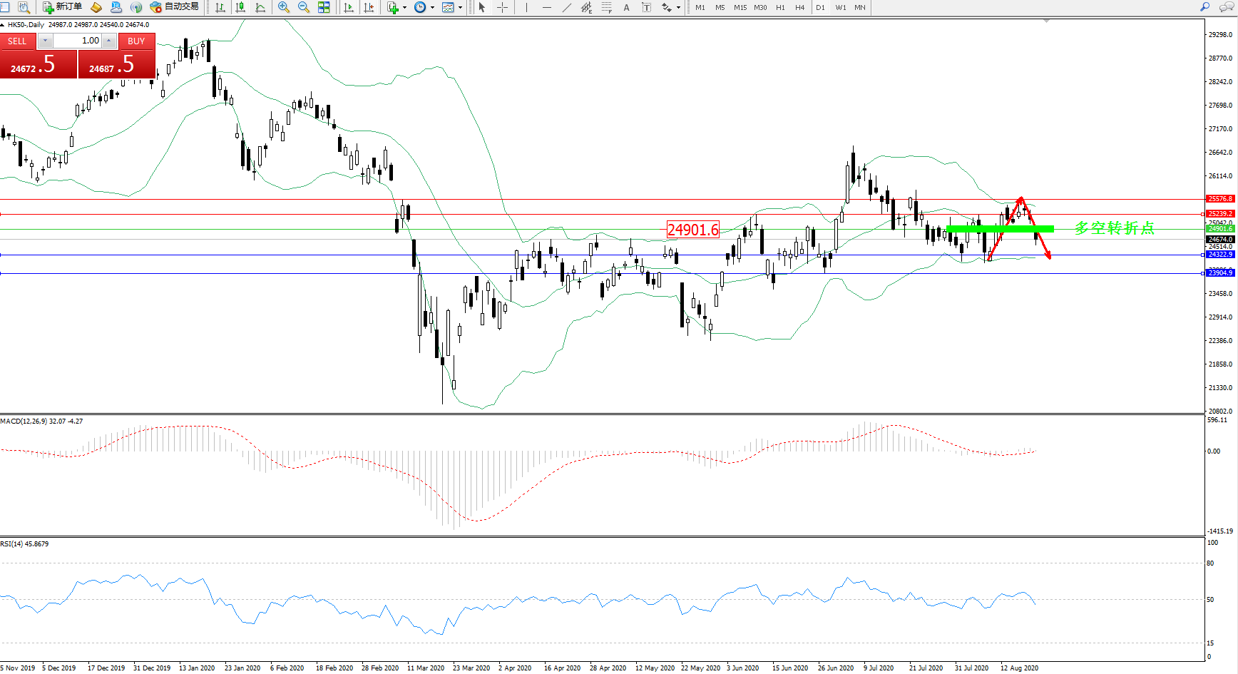 技术点评:高位空头动力持续弱势震荡下挫,处于布林带指标通道内持续宽幅震荡平移走势中,布林带指标呈收口走势态势良好,高位弱势下行或将持续,跌破中轨进入中下轨区间向下移动,关注中轨附近转折点,MACD指标处于0轴线附近弱势整理徘徊平移中,RSI指标处于多头区域弱势徘徊平移后空头动力急速下破50均衡线进入空头区域整理;