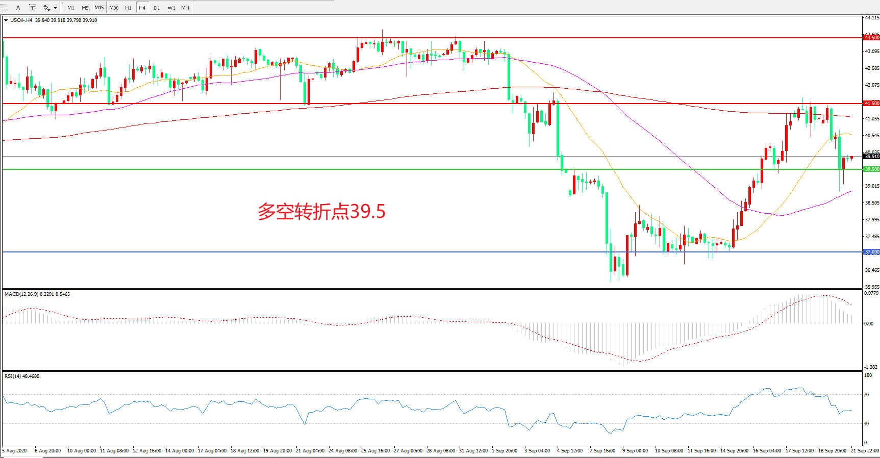 4小时图看,油价长阴下破,短期涨势遭到破坏,但39.5美元支撑依然强劲,均线系统走平,MACD红柱减少,RSI指标走平,日内延续震荡概率较大。