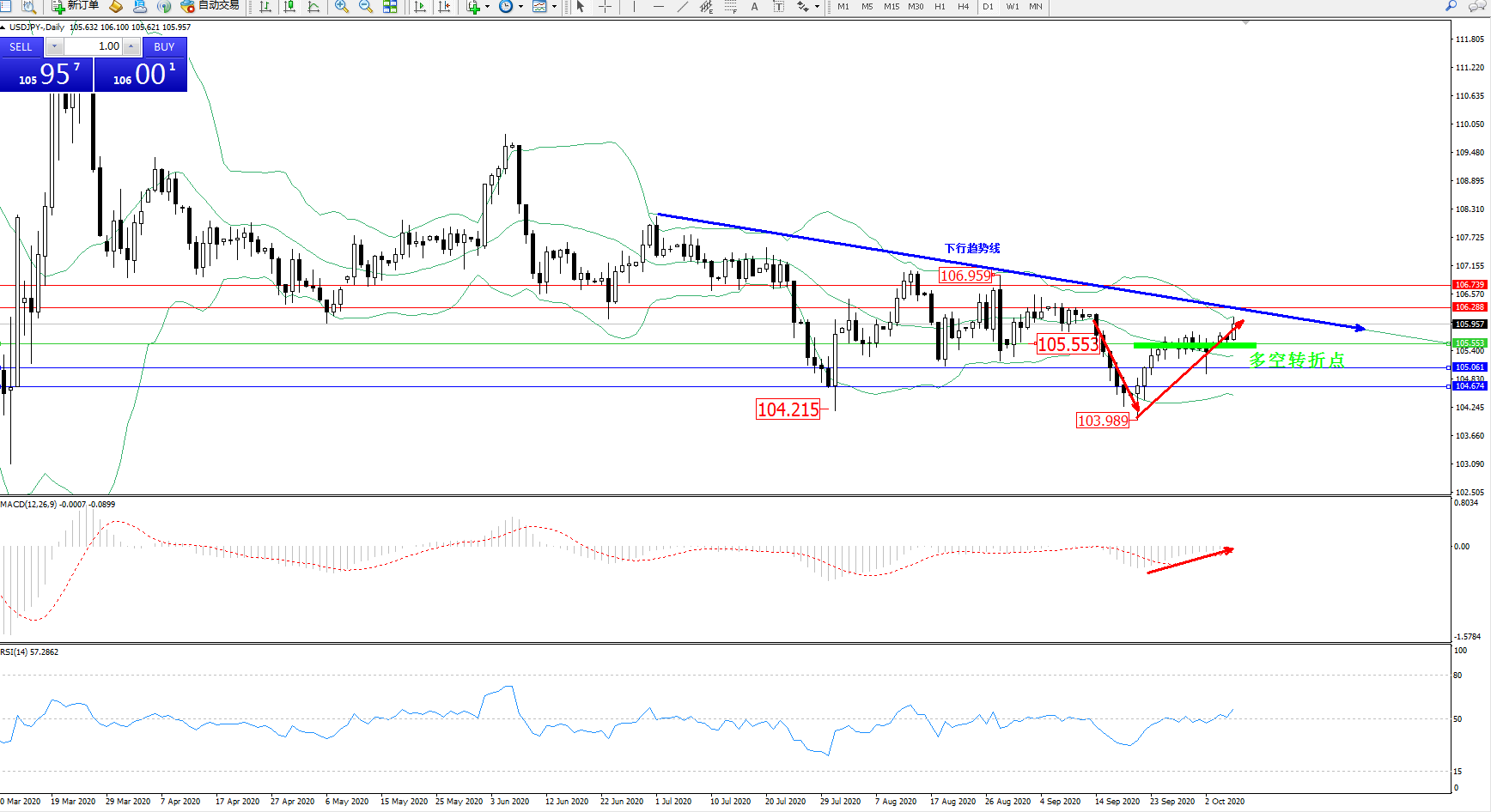 美元兑日圆回升至105.957附近,尽管美元指数回落,但避险日元表现更为弱势,主要是市场消化了特朗普叫停刺激计划谈判的消息后,美国股指期货上涨,打压了日元的避险买需。当市场意识到美国在不远的美国大选后肯定会推出新一轮刺激计划,市场担忧情绪快速降温。尽管刺激计划的谈判暂时被叫停,有关新刺激方案的谈判可能会在美国大选后重新开启,谈判双方都对此持更加积极的立场。美国总统特朗普表示他愿意批准一项有限的疫情纾困方案。前提是它们独立于更广泛的讨论并单独通过。