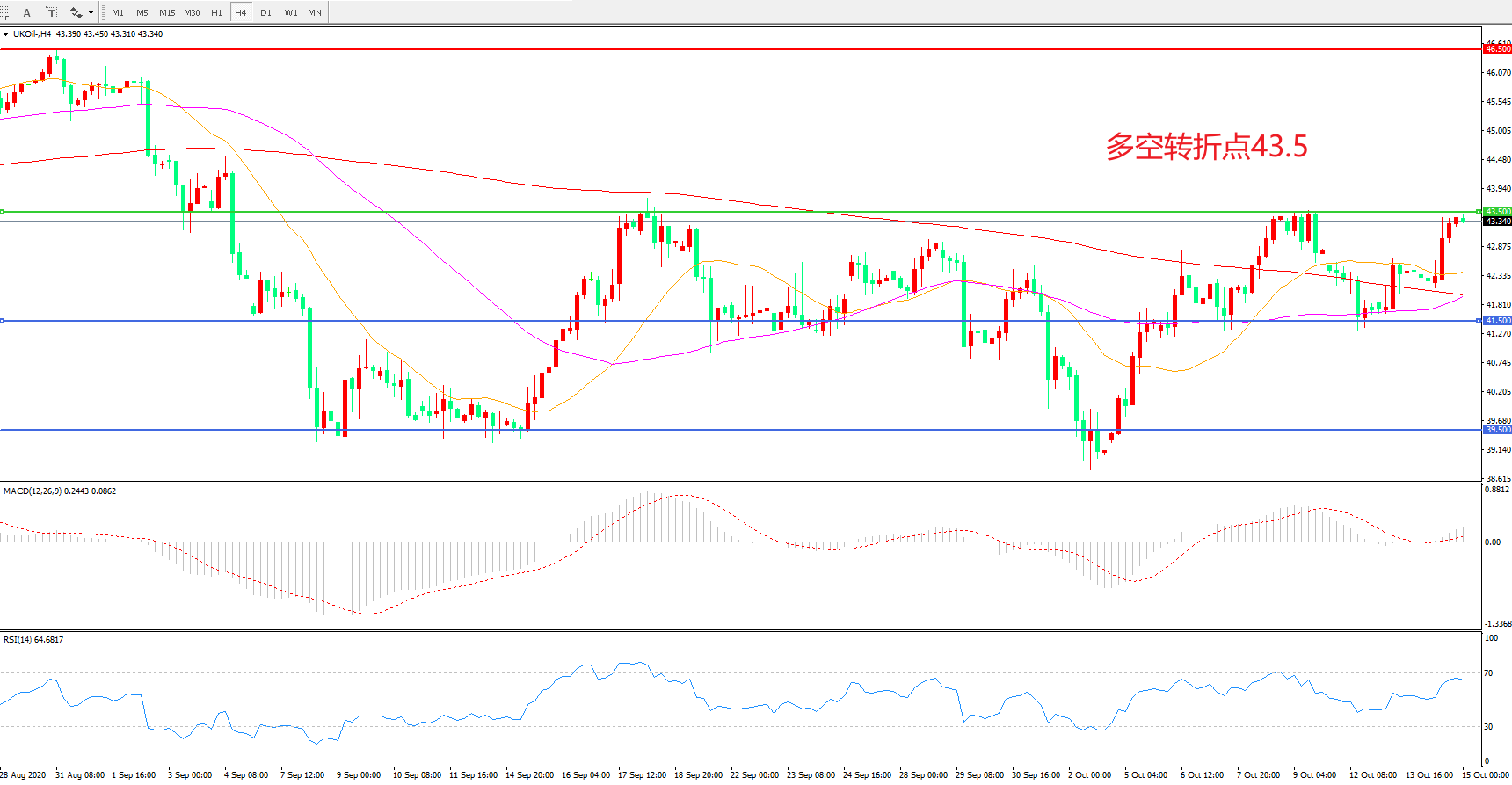 4小时图看,油价以55均线为依托大幅拉升,短期走势有所回暖,43.5成为短期多空分水岭,均线系统走平,MACD红柱增加,RSI指标走平,日内延续震荡概率较大。