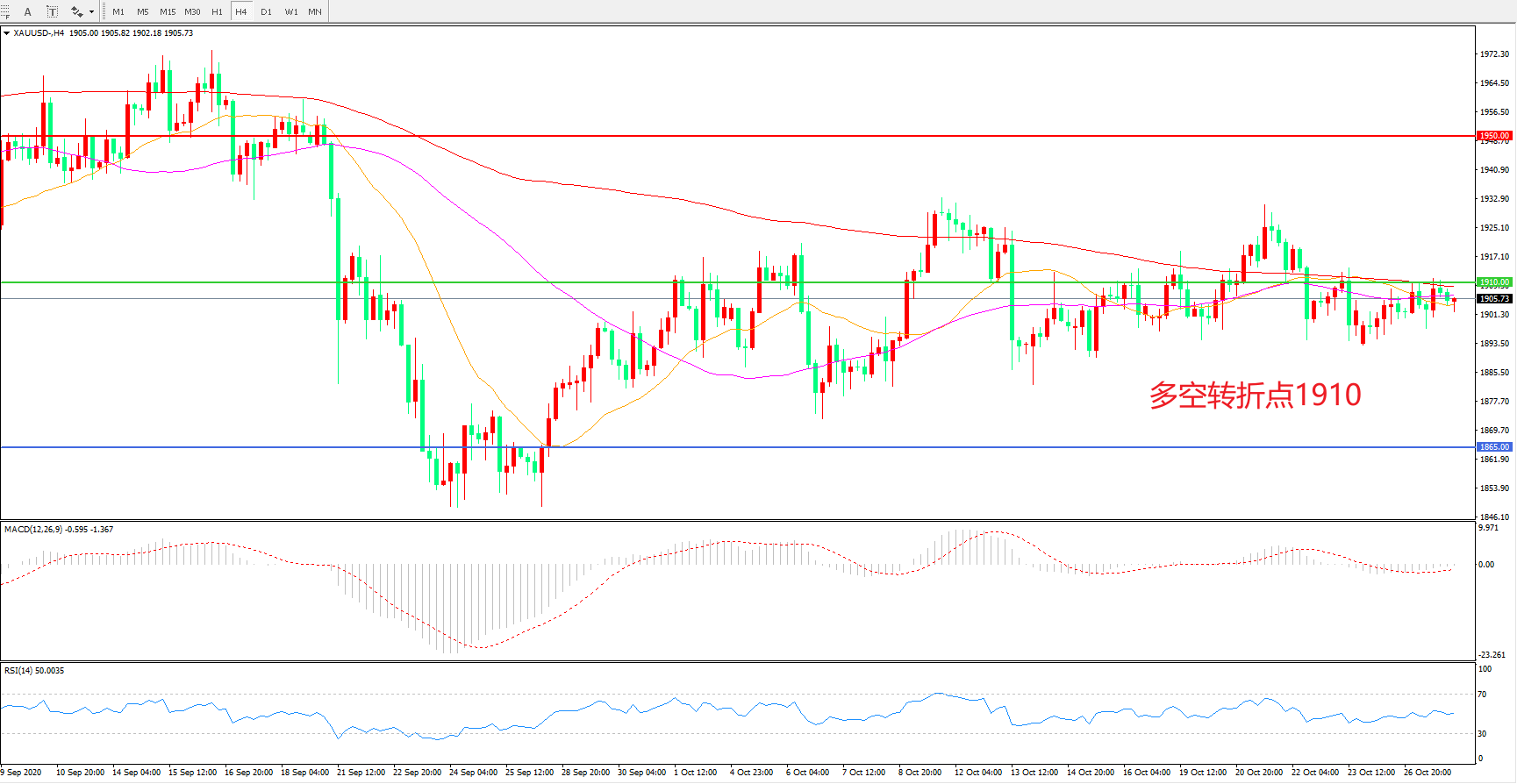 周一(10月26日),美元指数未能保住反弹势头,全天大幅下跌,金价受到提振,收报1902.63美元/盎司。近期不确定性事件纷至沓来,隔夜美股大跌,恐慌指数也大幅走高,令黄金获得一定避险需求。随着美国大选的逐渐临近,市场可能会等待消息面明朗之后才会出现趋势和方向。