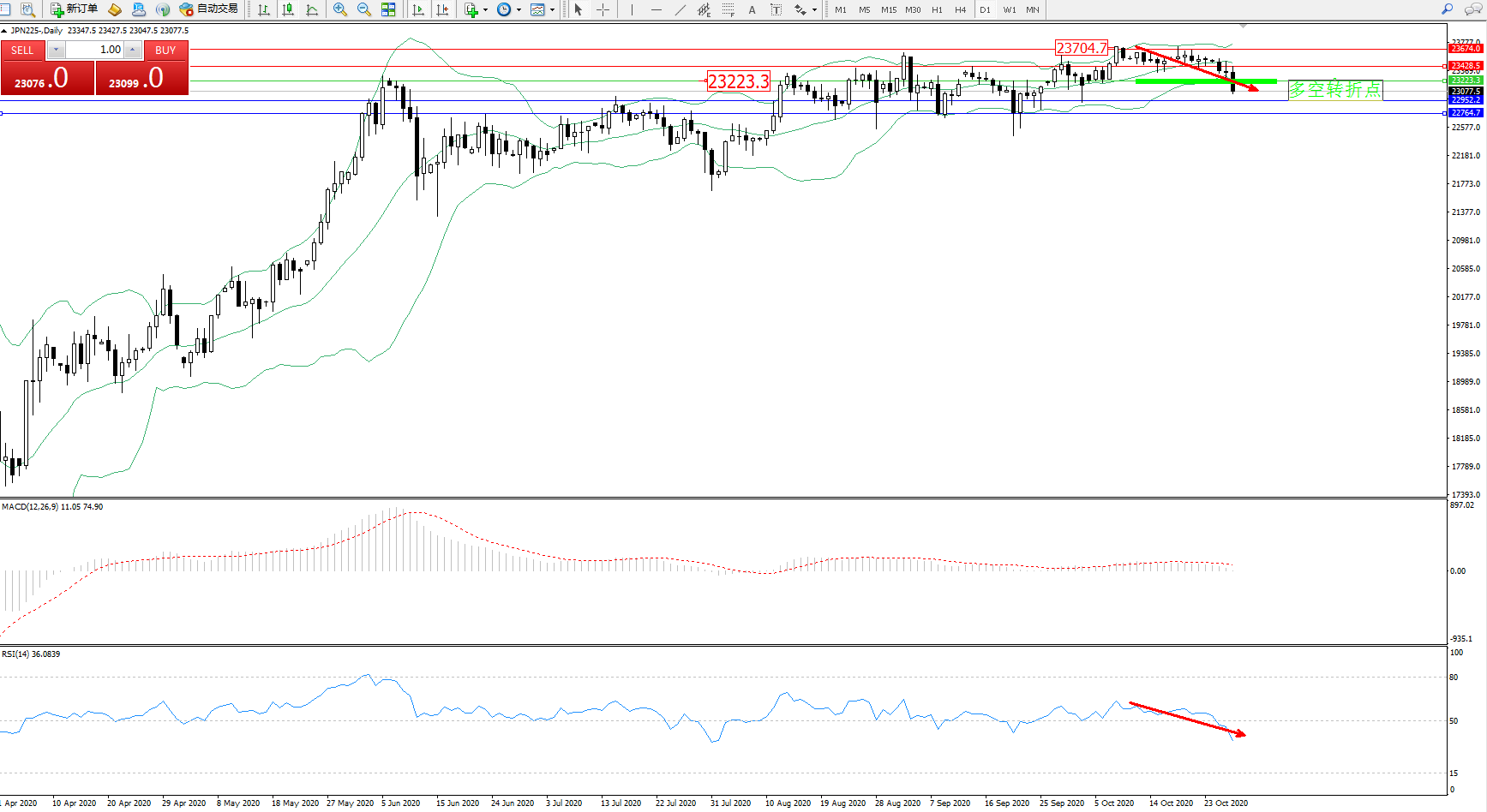 日经225指数10月28日(周三)收盘下跌49.30点,跌幅0.21%,报23436.50点。全球市场风险情绪继续发酵,避险资金进一步逃离美欧市场流向亚太地区,美国选情当前进一步紧绷,投资者一方面担心计票可能出现僵持局面,另一方面也更加担心白宫与国会两院分别由不同政党控制下,美国财政政策会蒙上更多阴影,迫使美联储强化行动,市场消息:日本首相菅义伟将下令最快在下周出台刺激政策。消费税是保障社会安全的必要工具。将对福岛核电站污水排放时间做出负责任的决定。将为2050年碳中和政策研究各种可能性,包括可再生能源以及核能在内。将采取必要措施保护就业。与中国保持稳定关系对地区和世界来说都是重要的。敦促韩国采取行动恢复与日本的关系。需要修建娱乐场所来促进日本旅游业。