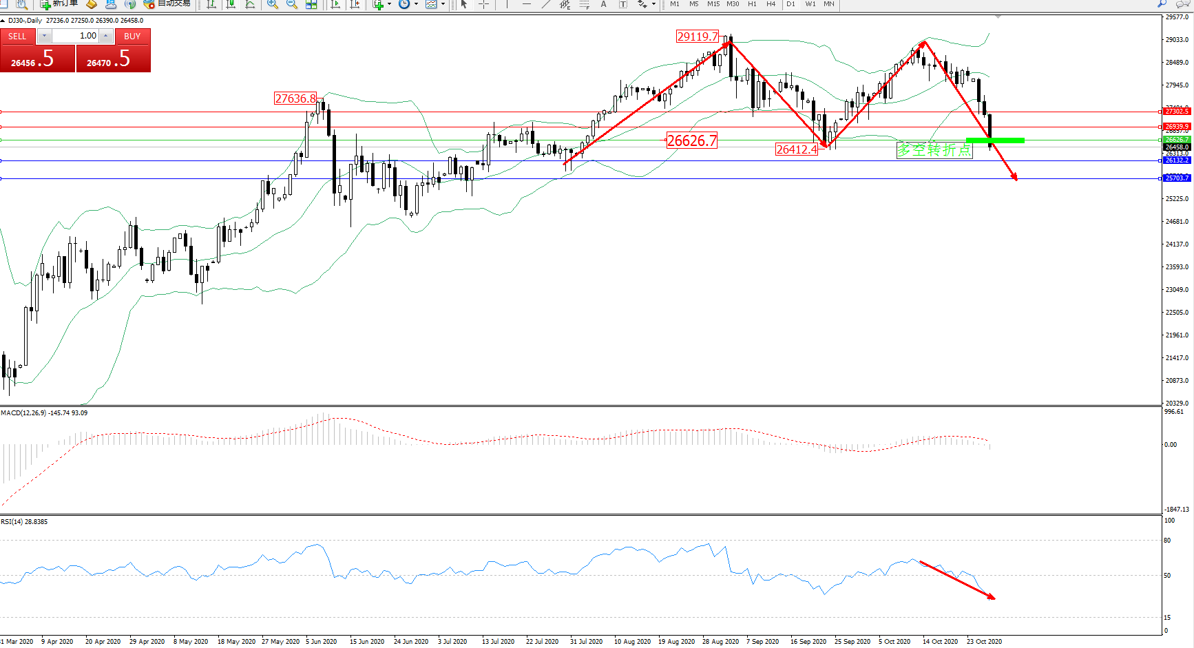 道琼斯指数10月28日(周三)收盘下跌942.40点,跌幅3.43%,报26520.74点。美股三大指数全线重挫,疫情反弹及更严厉的防疫封锁措施加剧了人们对新冠病毒造成经济影响的担忧。新冠住院人数激增,尤其在美国中西部地区。能源股随油价走低,科技股跌幅居前。微软走低,因该公司的业绩预期令人失望。用来衡量美国股市波动性的VIX指数攀升至6月以来的最高水平。美国将在11月3日举行大选,共和党和民主党之间关于如何计票的法律斗争增加了选举结果将出现争议的风险。尽管随着欧洲新冠病例激增,本周总体货币市场波动性仍然处于高位,但短期波动性指标的急升表明人们对美国大选结果感到担忧。