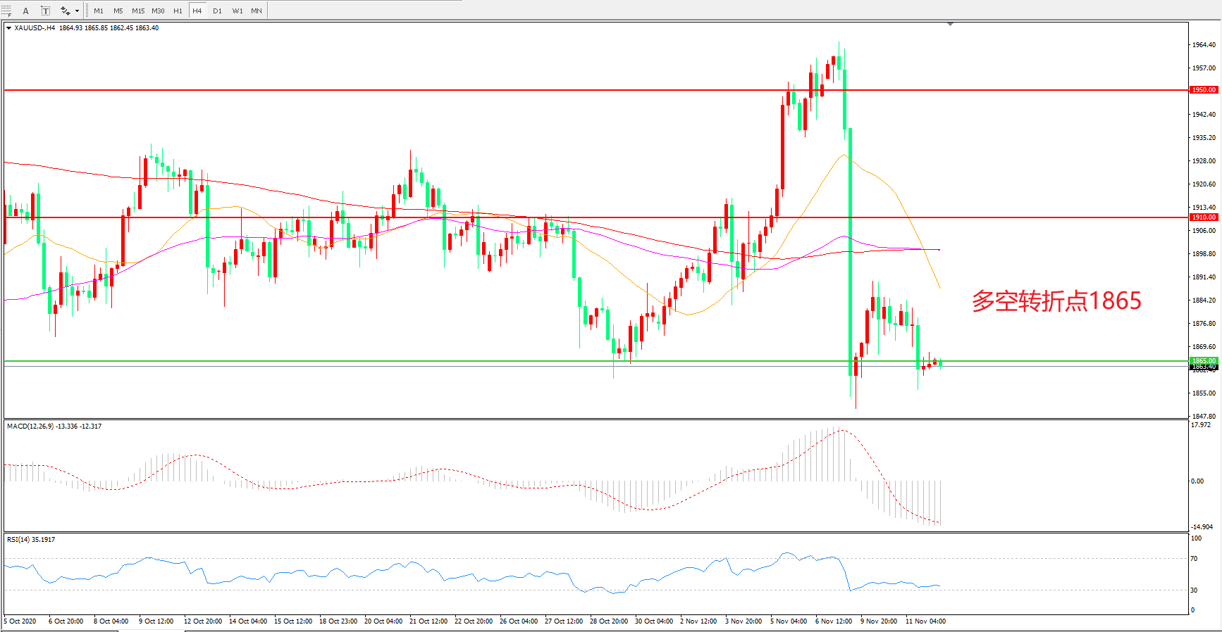 周三(11月11日),受美元上涨以及美债收益率上行施压,金价表现低迷,日内冲高后未能企稳,收报1862.78美元/盎司。目前围绕着新冠疫苗促进经济快速反弹的乐观情绪主导着市场,此外,美元走强成为金价反弹的“拦路虎”。