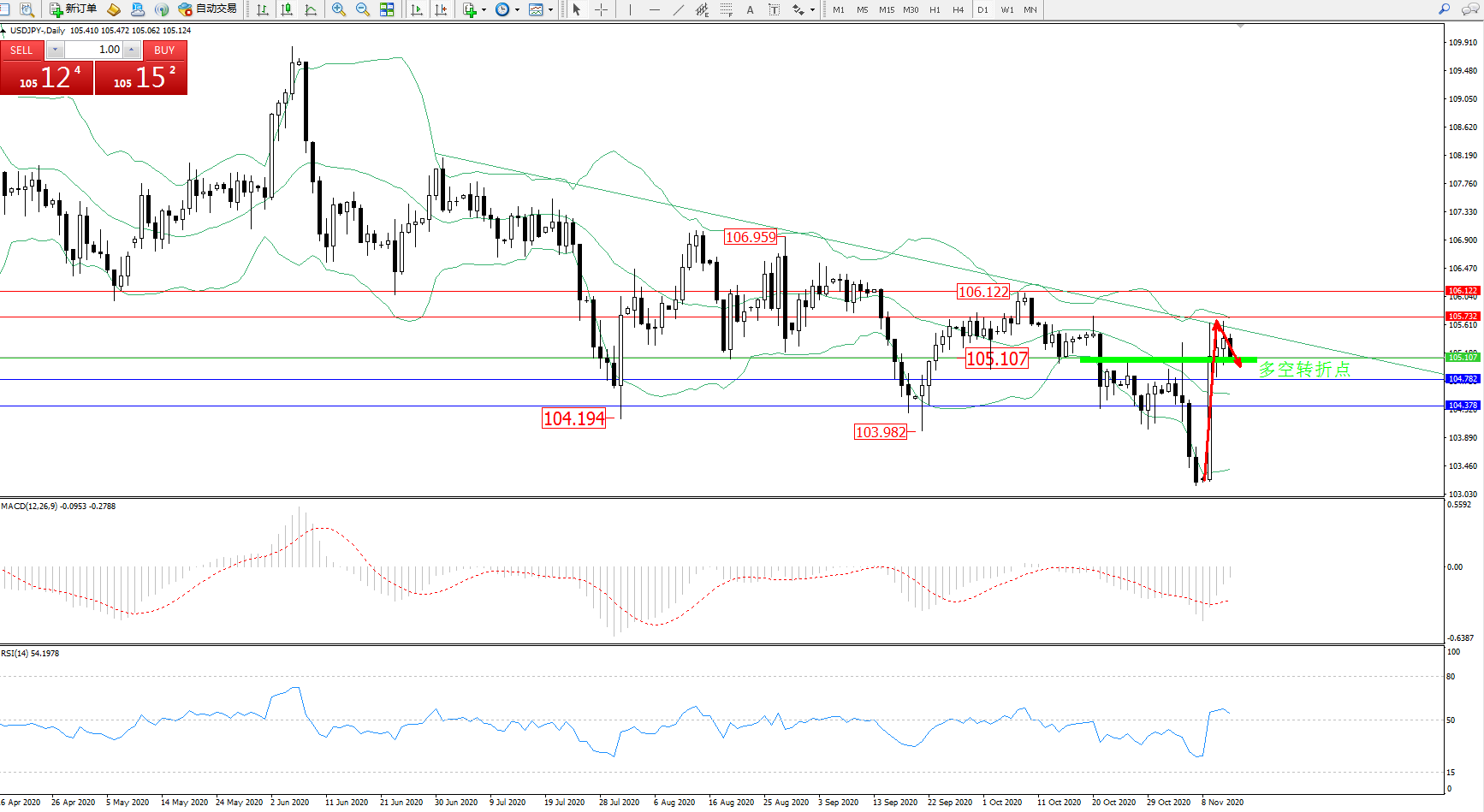 避险货币受疫苗消息影响,美元兑日元至105.13,日本新增创纪录的1634例新冠状病毒病例,日元仍受到一定避险支撑,美国选情仍不明朗,司法争执料将旷日持久,同时全球市场在消化了疫苗研发的初步利多后,转而重新对其应用前景重新审视,这平抑了之前过度乐观的情绪,各国股市普跌,也令日元受到支撑。虽然日元此前大跌,但在基本面未改,美国财政协议、欧洲疫情连同英国脱欧协议仍然成为市场不确定性消息的来源之背景下,年底之前,日元汇价整体强势的背景仍不会有根本改观,美元兑日元后市仍看空至104下方。然本周稍早疫苗研发领域的利好消息一度推动日元汇价大跌,但眼下,美元兑日元缺少动能上破106阻力位,因美国选情仍不明朗,司法争执料将旷日持久,同时全球市场在消化了疫苗研发的初步利多后,转而重新对其应用前景重新审视,这平抑了之前过度乐观的情绪,各国股市普跌,也令日元受到支撑。