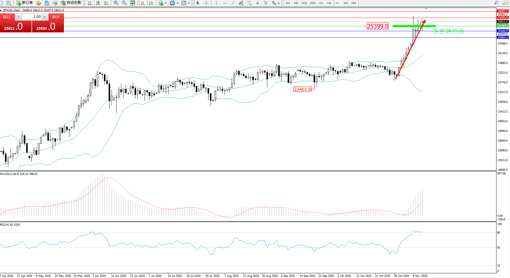 日经225指数11月13日(周五)收盘下跌149.38点,跌幅0.59%,报25371.50点。市场避险情绪有所升温。日本东京大学医学研究所教授河冈义裕等人组成的研究小组和美国北卡罗来纳大学的研究小组,13日在美国权威学术期刊《科学》上发文证实,与初期相比,目前在世界上流行的新冠病毒在变异后的传染性更强。,这种变异病毒以欧洲为起点向世界传播,目前欧美深陷疫情漩涡之中,反观亚洲疫情控制可圈可点,欧美避险资金有相当部分转移至亚洲。日本前首相安倍晋三接受共同社专访,围绕下届自民党总裁选举等问题进行回应。日本共同社12日报道,此次专访历时约1小时,对于即将在2021年秋季举行的自民党总裁选举,安倍认为,现任自民党总裁兼首相菅义伟“当然要继续执政”。当被问及是否可能第三次出任日本首相时,安倍否认道“没有考虑”。