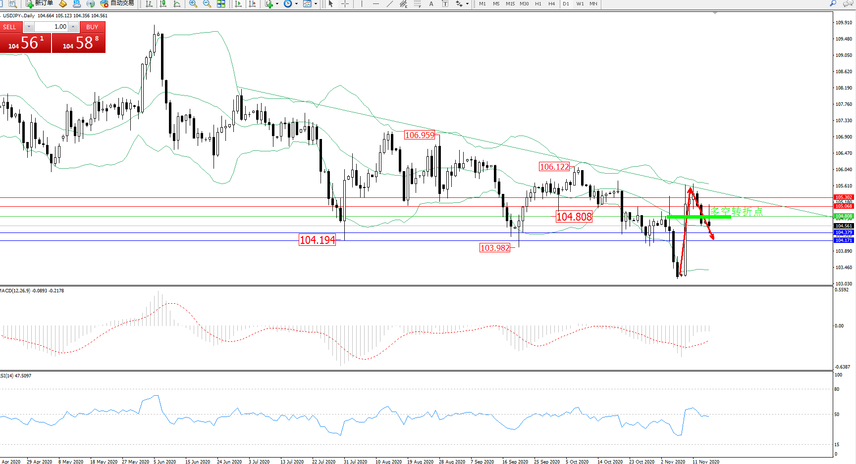 美元兑日圆高位出现回撤下移至104.561附近节点,期间巨震上涨至105附近,一度涨至105.13,因Moderna疫苗研发取得“突破性进展”,令全球市场情绪进一步转向全面乐观,导致避险资产遭到全面抛售。此前日元一度涨至104.57,因日本第三季度GDP数据创52年来最大增长,第三季度私人消费量为四个季度以来首次增长。日本外相茂木敏充今日表示,日本经济可能需要两年时间才能从疫情的影响中完全恢复。日本经济再生大臣西村康稔也表示日本经济正在稳步回升,但复苏进程仍处于中途,目标是在2022年将经济恢复至疫情前的水平。他充分肯定了区域全面经济伙伴关系协定(RCEP)签订的重大意义。