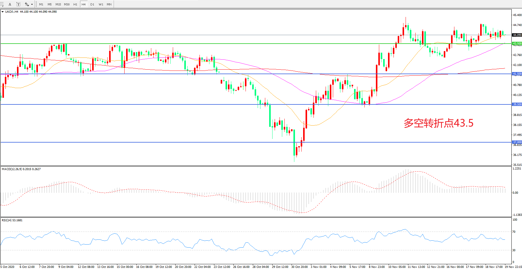 4小时图看,油价在连续震荡后逐渐站稳21周期均线,短期表现有所回暖,43.5成为多空分水岭,MACD红柱增加,RSI指标走平,日内震荡上行概率较大。