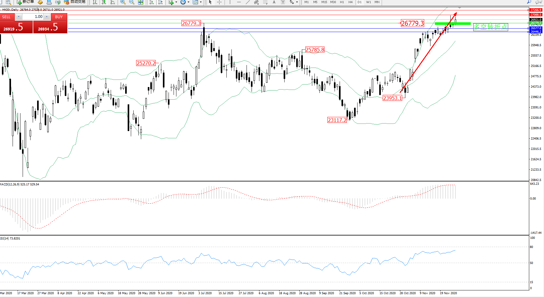 香港恒生指数11月27日(周五)收盘上涨75.23点,涨幅0.28%,报26894.68点;港股尾盘拉升,恒指一度站上27000点,恒生科技指数涨0.41%。阿里概念股全天强势,油价下跌,石油股全线低迷;光伏股、风电股、纸业股、港口航运股普跌。恒生科技股涨跌各半,美团升超1%,京东、腾讯小幅收跌。今日南下资金净流入59.28亿港元,大市成交额为1127.2亿港元。隔夜美股市场休市,欧洲股市表现平静,市场短期陷入震荡调整的局势。随着疫情得到控制,盈利最差的时期已经过去,低基数及政策刺激或推升恒指2021年盈利大幅反弹。伴随全球经济的回暖与大宗商品的上涨,早前与港交所进行投资者会议,港交所在多个领域均有强劲商业动力,因此对该股保持乐观,报告主要提及港交所拥有强劲现金业务,但公司认知到其在衍生部份未能全面捕捉机会,尤其是与新加坡交易所方竞争,如市场架构、开市时间及公众假期交易等。长远看,港交所相信香港可以在流动性及MSCI A股指数相关产品,提供独特及全面性产品。