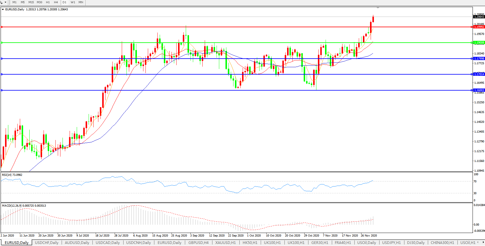 Tempus, Inc交易副总裁John Doyle说,交易员正在寻找一切理由来推高风险资产,而这是以美元为代价的,在希望破灭后,当有报导称两党仍有可能就刺激计划达成协议时,这是推高风险资产并卖出美元的又一个理由。对新冠病例上升的担忧挥之不去,并未给美元提供太多避险支撑。越来越多的人猜测,美联储将采取行动,在接种疫苗之前支撑经济度过一个艰难的冬天。这应该会进一步打压美元。美联储主席鲍威尔和财政部官员努钦周二敦促国会为小企业提供更多帮助,目前新冠疫情不断加剧,他们担心疫苗带来的缓解可能无法及时挽救这些企业免遭破产的命运。欧元兑美元盘中触及1.2077美元的两年半高位,尾盘上涨1.21%,报1.2071;加拿大丰业银行在一份研究报告中称,支持欧元在中短期进一步上涨的技术理由相当令人信服。11月价格走势总体对欧元有利,突破(下半月)盘整区间暗示欧元有升向1.25-1.26美元的潜力。。