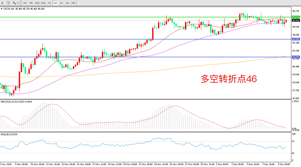 4小时图看,油价陷入高位震荡,46美元成为上方阻力,55周期均线成为短期支撑,MACD红柱减少,RSI指标向上,日内延续震荡概率较大。
