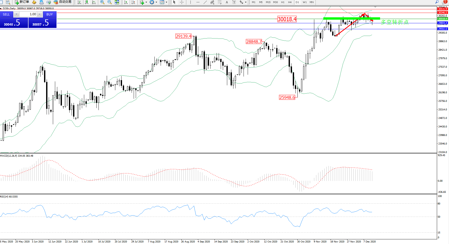 道琼斯指数DJ30—— 日K线图显示: