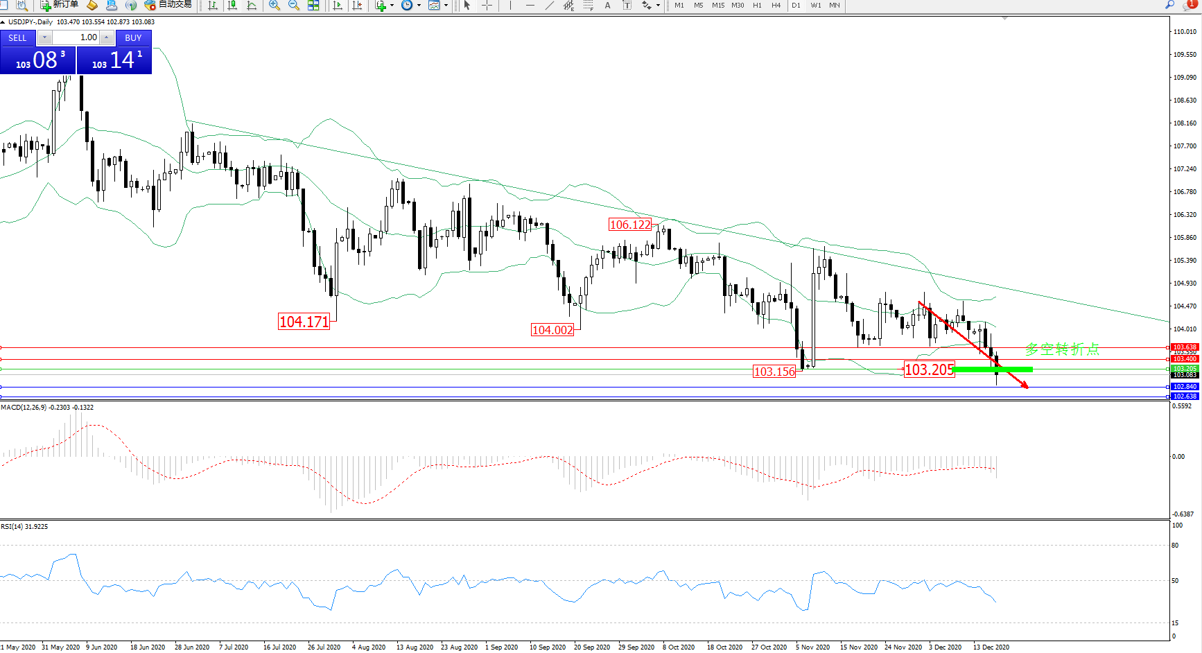 技术点评:高位空头动力延续布林带指标下轨持续震荡下行态势良好,跌破前期低位103.156位置节点后有继续下行态势,布林带指标呈张口走势态势良好且持续下行中,跌势未有止步迹象,MACD指标处于0轴线下方空头区域维持整理后开始缓慢下行,RSI指标处于50均衡线下方空头区域维持整理缓慢下行;