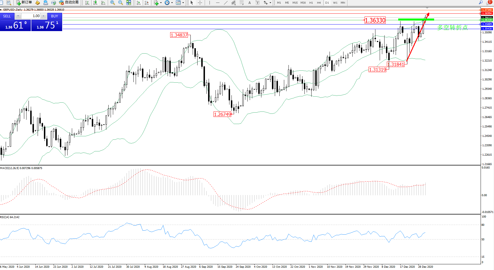 交易策略:1.36330上方看涨,目标1.36994、1.37340