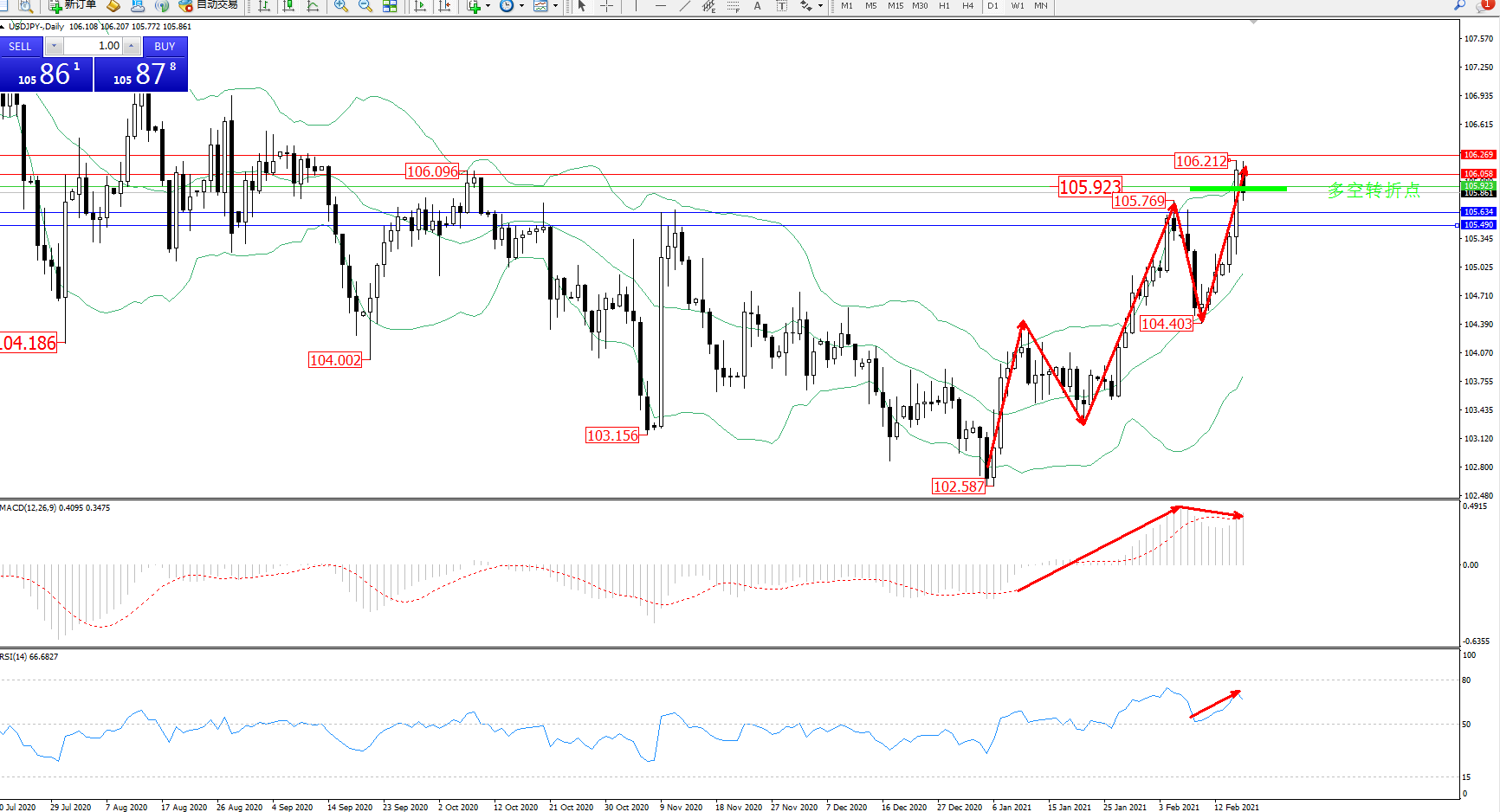 美元兑日圆处于105.861附近整理,昨日周三亚市早盘一度冲高至106.22这一自去年9月份以来的五个月高位,此后在美债收益率回落,多头获利盘趁机出脱的交易影响下,虽然日本日内开始接种疫苗的行动令投资者悲观情绪得到缓和,但毕竟其进度已过相比美欧严重落后,与此同时,东京奥运会举办过程中仍存在的种种变数,尤其是近期奥组委高层人事意外变动所带来的冲击,对于日元汇价也继续构成负面打压;对日本中长期经济前景不那么乐观;目前,疫情封锁对很大一部分日本经济造成冲击,而日本目前的家庭财务状况不像英国那样强劲;为了使日本经济获得长期增长势头,可能需要额外的财政刺激来支持消费支出。