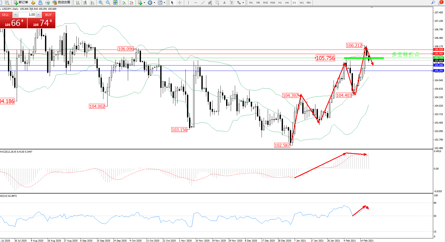美元兑日圆高位回撤至105.669附近整理,在日本东京奥组委经历人事变动后,前景仍然扑朔迷离的背景下,日元汇价所承受的压力也依旧在延续,同时美元指数继续保持坚挺的格局则也令美元兑日元汇价下行空间受限;市场同时也在关注日本开始注射疫苗后的成效与进程,但在其起步已经明显落后的背景下,日元避险地位的进一步削弱仍将在所难免。鉴于美国利率走高推升美元的近期可能性,有必要仔细研究做多新兴市场货币的其他融资方式”;10年期美债收益率走升时日元倾向于走软,而10年期日本国债收益率基本固定,这对美日利差产生了上行压力。