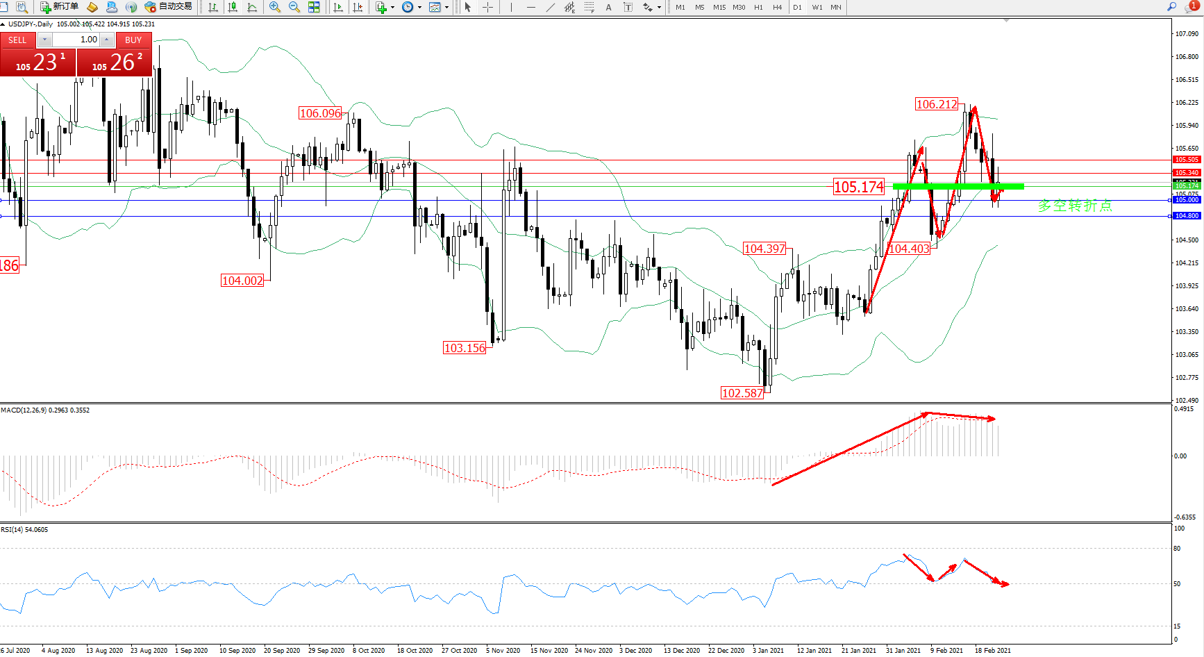 美元兑日圆纠结于105.231附近巨震,据日本富士新闻网:东京新增275例新冠肺炎确诊病例。日本将于周五决定是否于3月7日解除东京地区的紧急状态。日本政府计划提前解除关西3府县(大阪、京都、兵库)和中京2县(爱知、岐阜)的紧急状态,现正在就此进行研讨。据报道,日本政府将于26日向新冠肺炎疫情基本对策方针等咨询委员会征询专家意见,之后召开新冠肺炎疫情对策总部会议作出决定。据悉,日本政府考虑不再继续延长即将于3月7日到期的紧急事态宣言实施期限。疫苗接种速度令人印象深刻,为全球经济强劲复苏增添了希望。这与美国总统拜登提出的1.9万亿美元经济刺激计划取得的进展一道,继续提振投资者的信心。这反过来削弱了作为避险货币的日元,并对美元兑日元提供了一些支撑。美元盘中从六周低点强劲反弹,为美元兑日元提供了额外的提振。