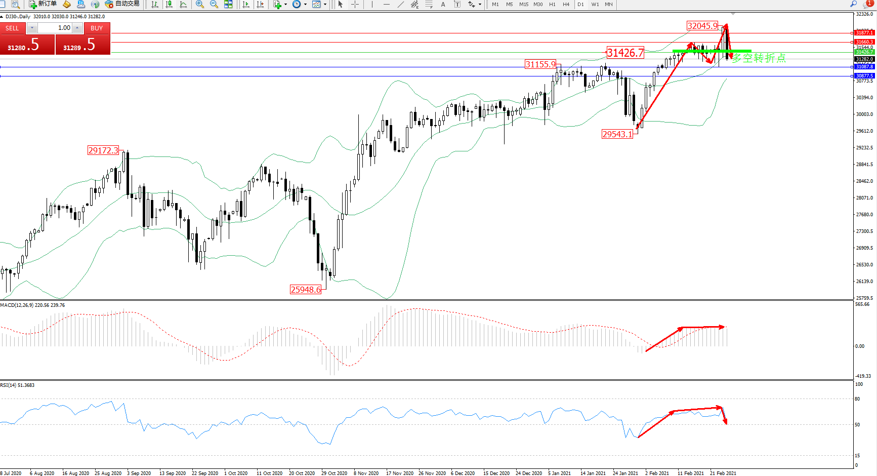 技术点评:多头动力延续布林带指标通道中上轨区间持续震荡上扬,高位触及上轨附近节点32045附近后遇阻回撤,纠结于中轨附近持续震荡中,有继续回撤向下移动迹象,布林带指标呈收口走势持续中,MACD指标处于多头区域维持整理平移中,RSI指标处于多头区域维持整理平移后即将触及50均衡线附近节点;