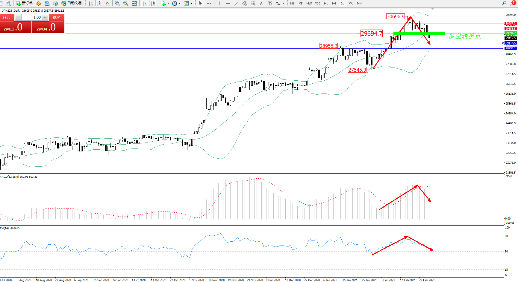 技术点评:多头动力延续布林带指标通道中上轨区间持续震荡上扬态势良好,高位抵达30696附近节点后遇阻开始整理平移,空头动力伺机入场,反转急速下挫跌破布林带指标中轨附近节点后进入中下轨区间整理,布林带指标呈收口走势持续中,关注中轨附近节点,MACD指标处于多头区域高位整理反转下行中,RSI指标处于多头区域维持整理缓慢下行至50均衡线附近整理中;