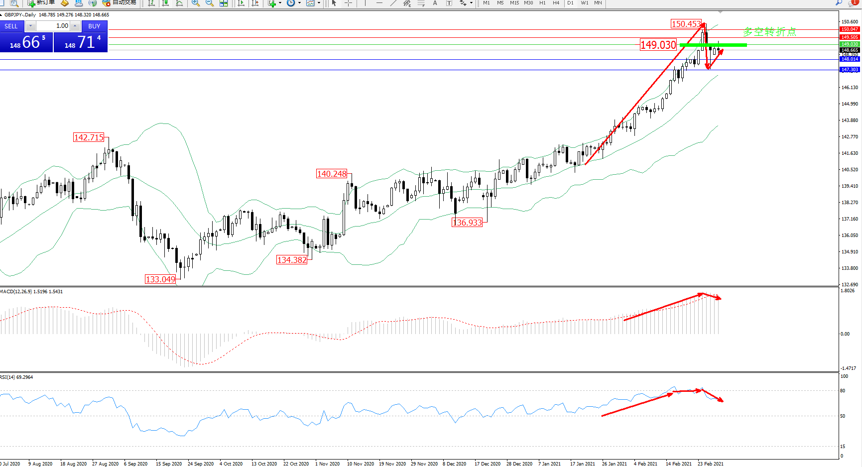 技术点评:多头动力延续布林带指标通道中上轨区间持续震荡上扬态势良好,高位抵达150.453附近节点后遇阻回撤,纠结于中上轨区间震荡,多头动力短暂遇阻,但上行趋势尚未有最终改变态势,布林带指标呈上行走势不断向上移动中,MACD指标处于多头区域维持平缓上扬后高位开始走平,RSI指标处于多头区域超买区80均衡线附近整理后开始缓慢下移走平;