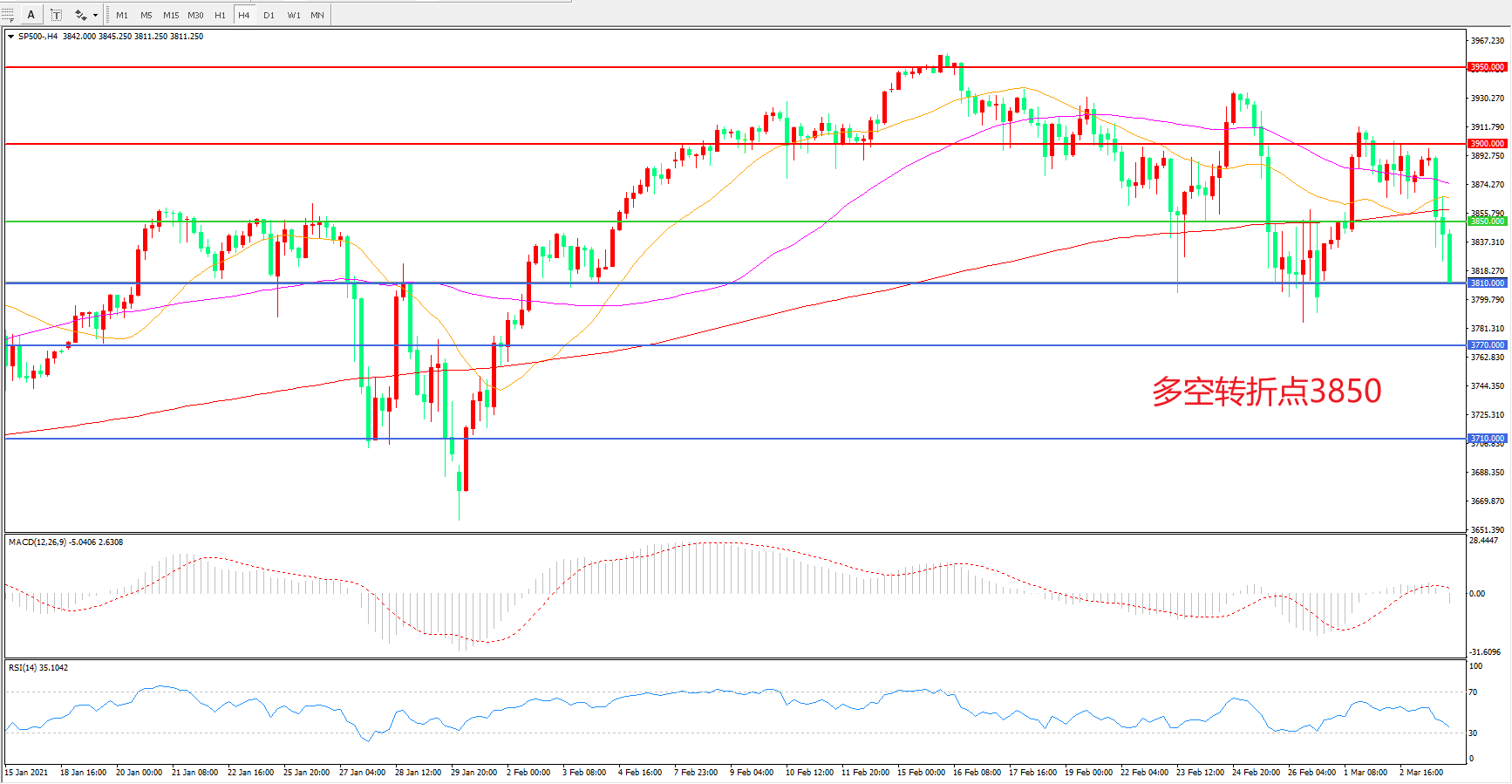 周三(3月3日),美债收益率再度强势攀升,市场通胀压力加大,加之经济数据表现不佳,美股继续承受下行压力,标普500长阴下破,收报3814.50点。其中大型科技股再度暴跌,奈飞跌近5%,亚马逊跌近2.9%,苹果、微软均跌超2%。目前拜登1.9万亿美元的刺激计划将在参议院进行考验,议员们正就具体细节条款讨价还价,刺激法案能否顺利通过对美股后续走势会产生重大影响。