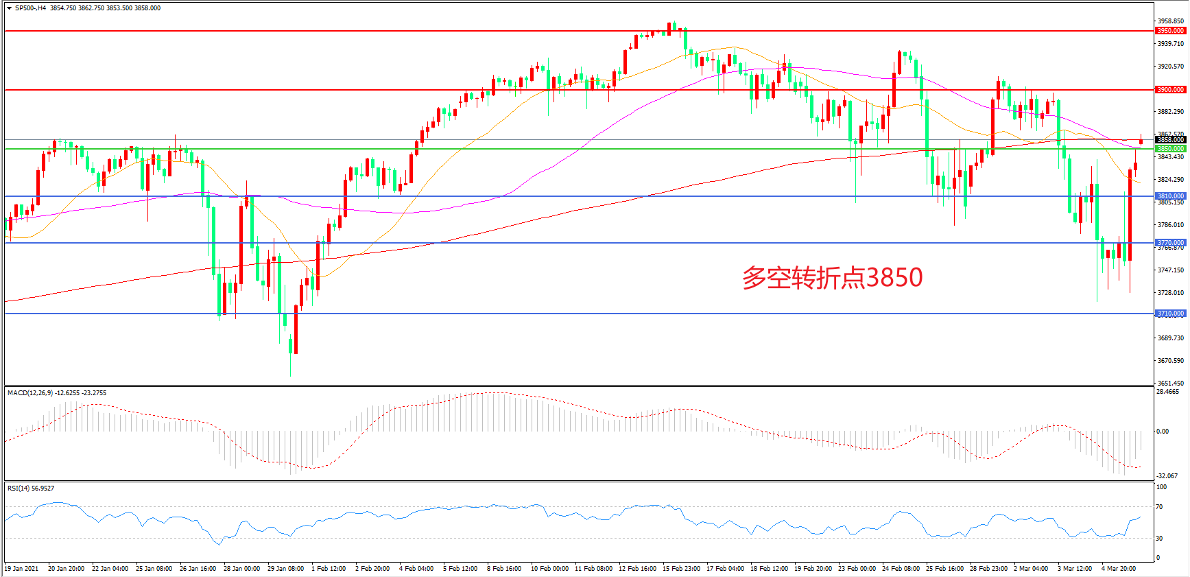 上周五(3月5日),美国非农就业数据公布,非农就业人口大增37.9万人,好于市场预期,标普500走出绝地反弹的深V行情,先跌后涨后收报3838.25点。由于美债收益率徘徊一年高位,大型科技股盘中再度领跌,亚马逊全周跌近3%,奈飞全周跌超4%。特斯拉最深跌超13%,收跌近4%。
