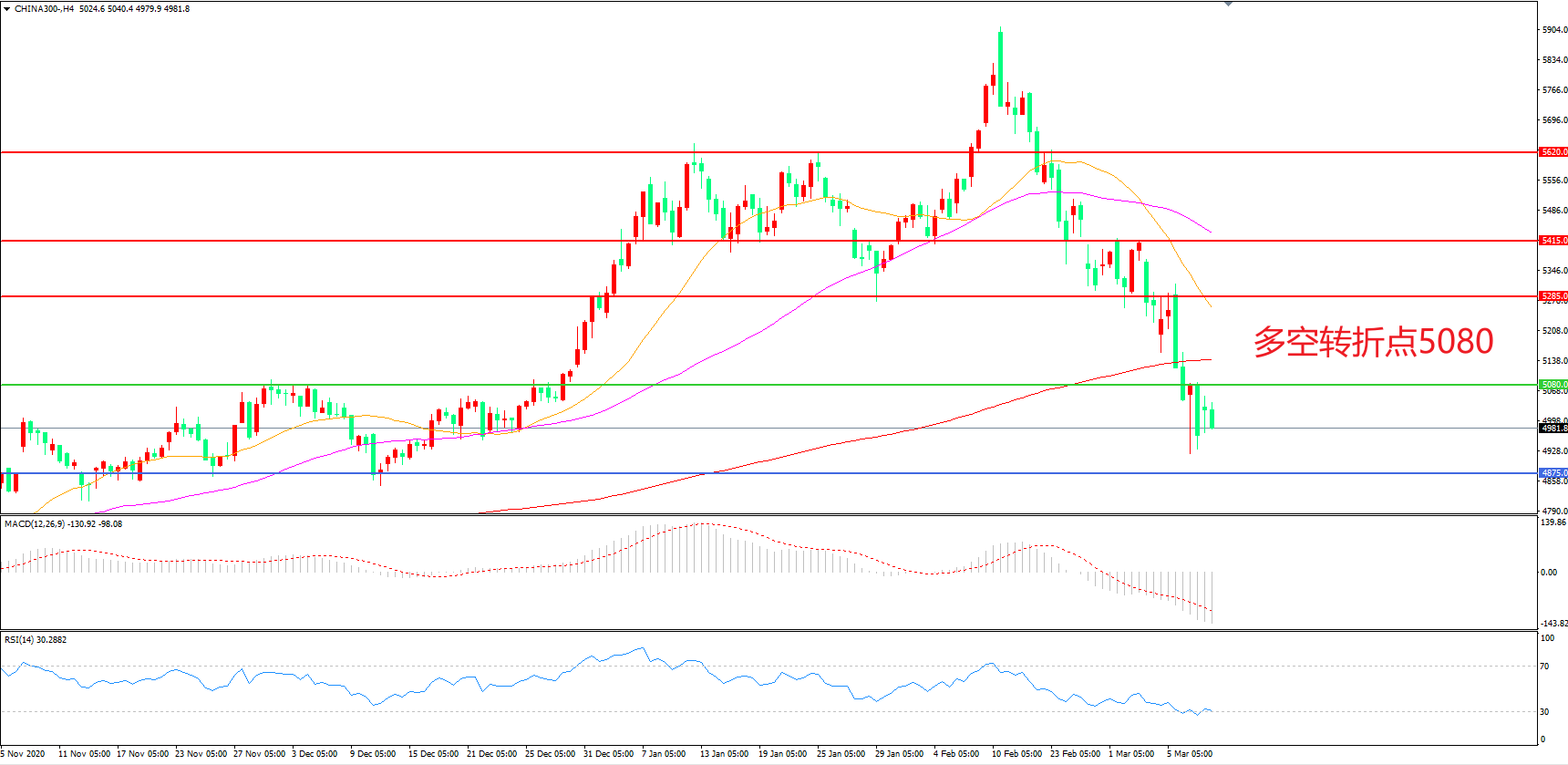 4小时图看,沪深300连续长阴下破,整体表现相对低迷,200周期均线被跌破,MACD绿柱增加,RSI指标走平,日内延续下行概率较大。