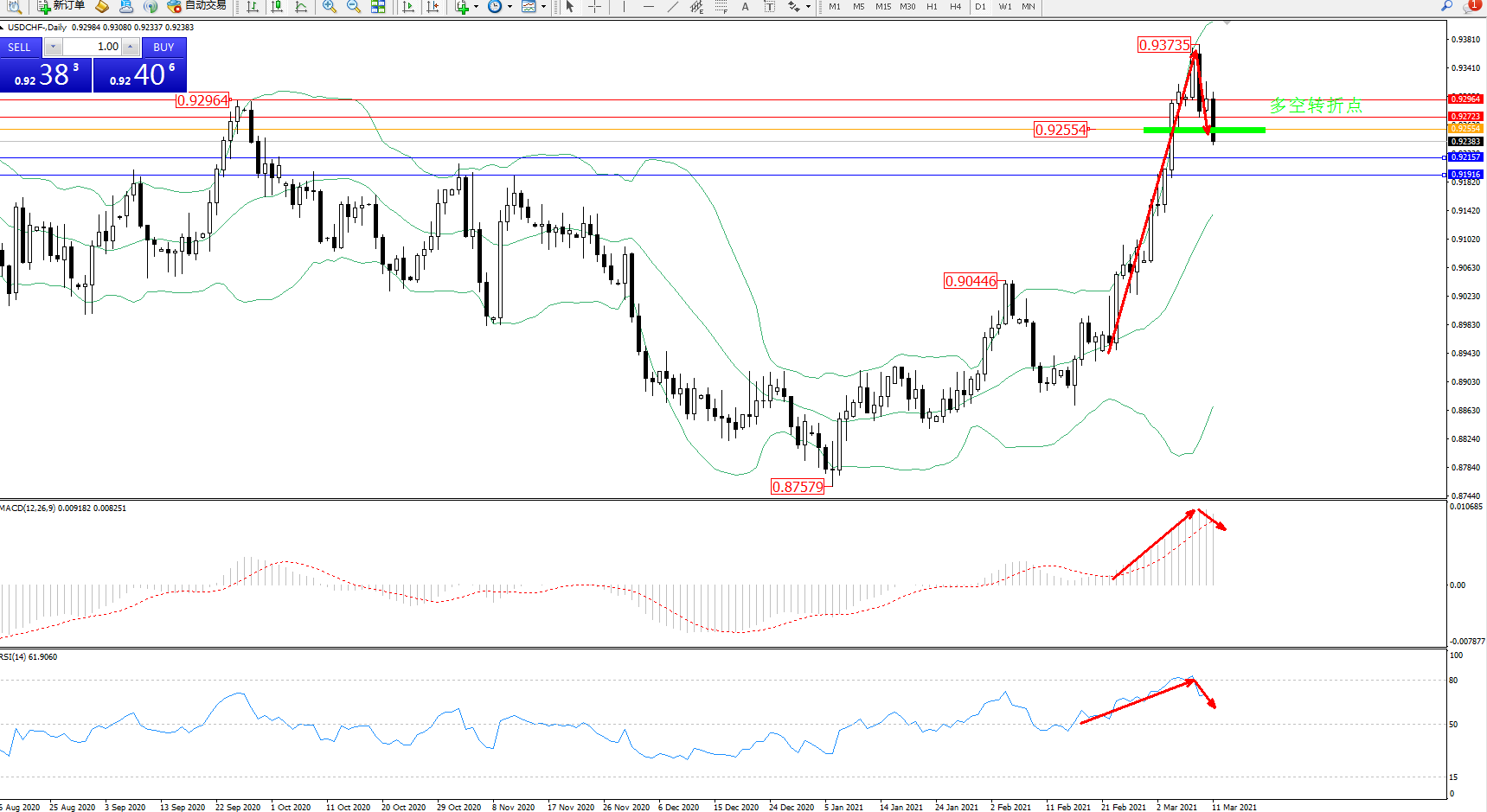 备选策略:0.92554上方看涨,目标0.92723、0.92964