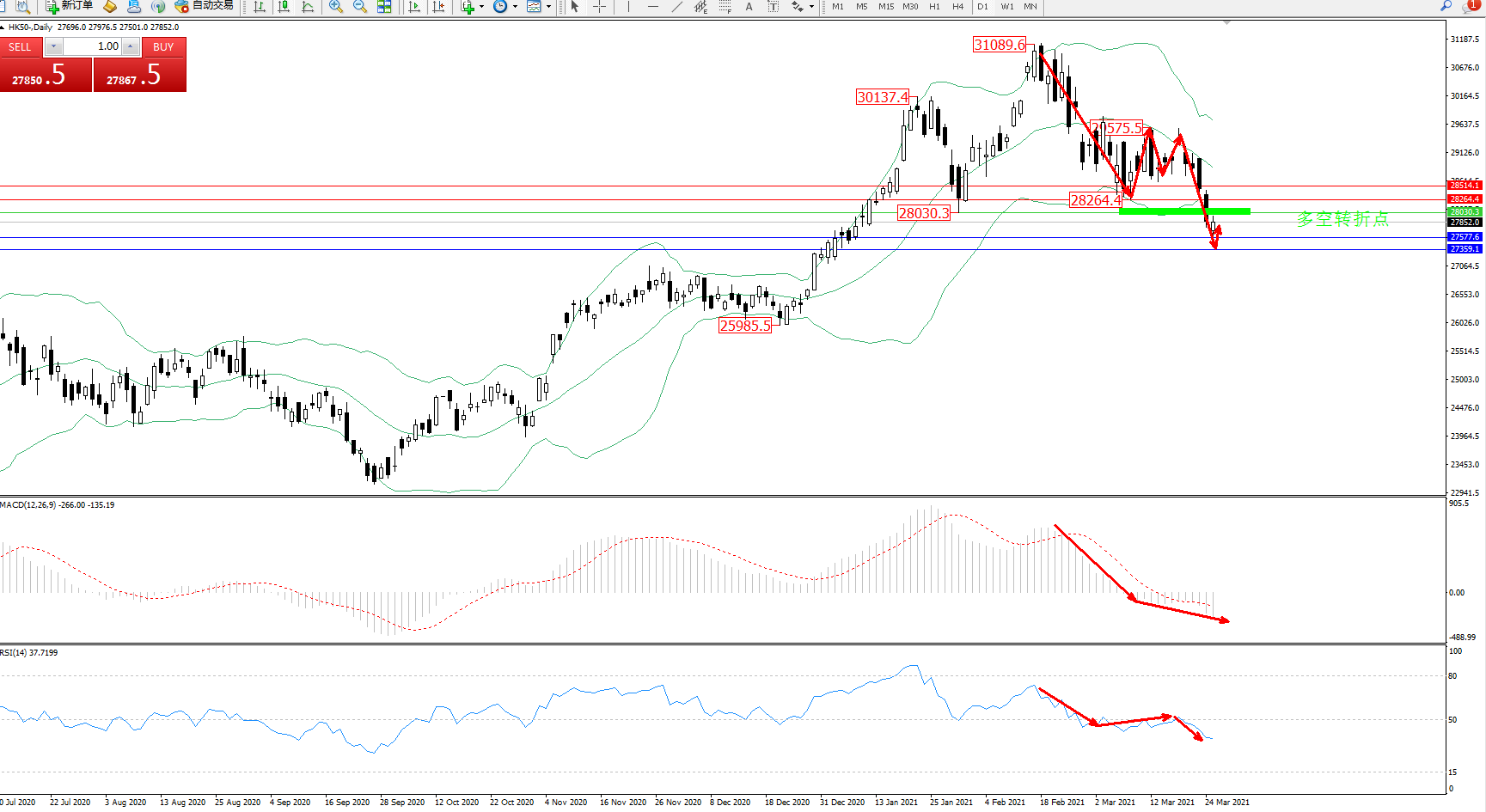 香港恒生指数3月25日(周四)收盘下跌18.53点,跌幅0.07%,报27899.61点;港股低开高走,与前2日大跌相比,三大指数有企稳反弹现象。恒生科技指数跌1.2%报7944点,,H&M事件不断发酵,体育用品股大涨,李宁、安踏均大幅拉升,涨幅十分亮眼,香港银行股走强支撑大市回升;大型科技股集体收跌,阿里巴巴跌3.9%,腾讯跌2.8%,美团等均有跌幅,区块链股、碳中和概念股全天走弱。今日南下资金净流出12.28亿港元,大市成交额重上2千亿港元。南下资金今日净卖出15.67亿港元。港股通(沪)方面,中国移动遭净卖出9.72亿港元,中芯国际遭净卖出3.59亿港元。港股通(深)方面,腾讯控股遭净卖出5.26亿港元,李宁遭净卖出3.20亿港元。政府统计处公布,香港整体出口货值连升四个月,今年2月达3111亿港元,按年升30.4%,比今年1月的44%收窄,但胜市场预估的28.4%升幅,而进口货值为3258亿港元,按年亦升17.6%,较1月升37.7%及市场预测升22.2%为低。今年2月份,香港录得有形贸易逆差147亿港元,相等于商品进口货值的4.5%。