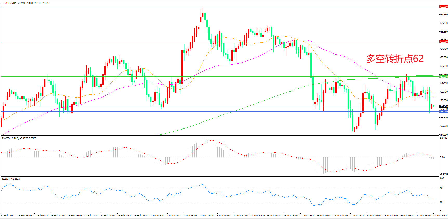 周三(3月31日),根据美国能源信息署公布的EIA数据显示,当周原油库存下降87.60万桶,降幅不及预期,但精炼油库存却出人意料地大幅增加,美国WTI原油震荡走低,收报59.47美元/桶。OPEC+联合技术委员会议结束后,并未做出任何产油方面的政策建议,交易者正在密切关注今天的OPEC+产油政策会议,在此次会议上将会确定5月份的原油产量。