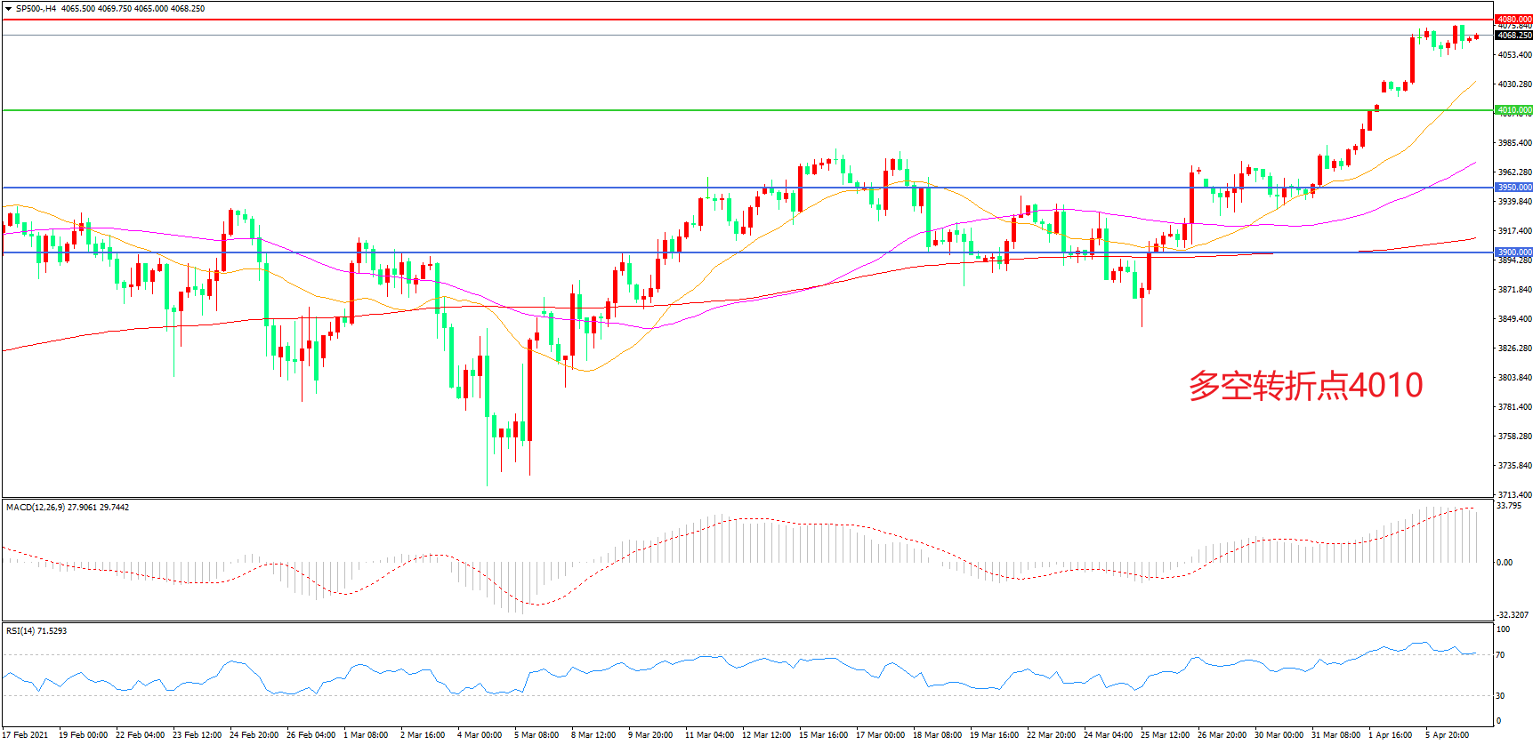 周二(4月6日),美国经济数据继续支持复苏向好的前景,美债收益率持续回落,标普500在屡创新高后涨势暂歇,小幅收跌,收报4066.75点。111大板块中,有5个收跌,其中跌近0.4%的信息技术领跌,上涨板块中,涨逾0.5%的公用事业领跑。大型科技股中,只有涨逾0.2%的苹果、涨0.7%的奈飞两只收涨,Facebook跌近0.9%,微软跌近0.5%。如今经济数据表现强劲叠加刺激政策的逐步落地,意味着美国在三季度岀现经济过热的可能性非常高。