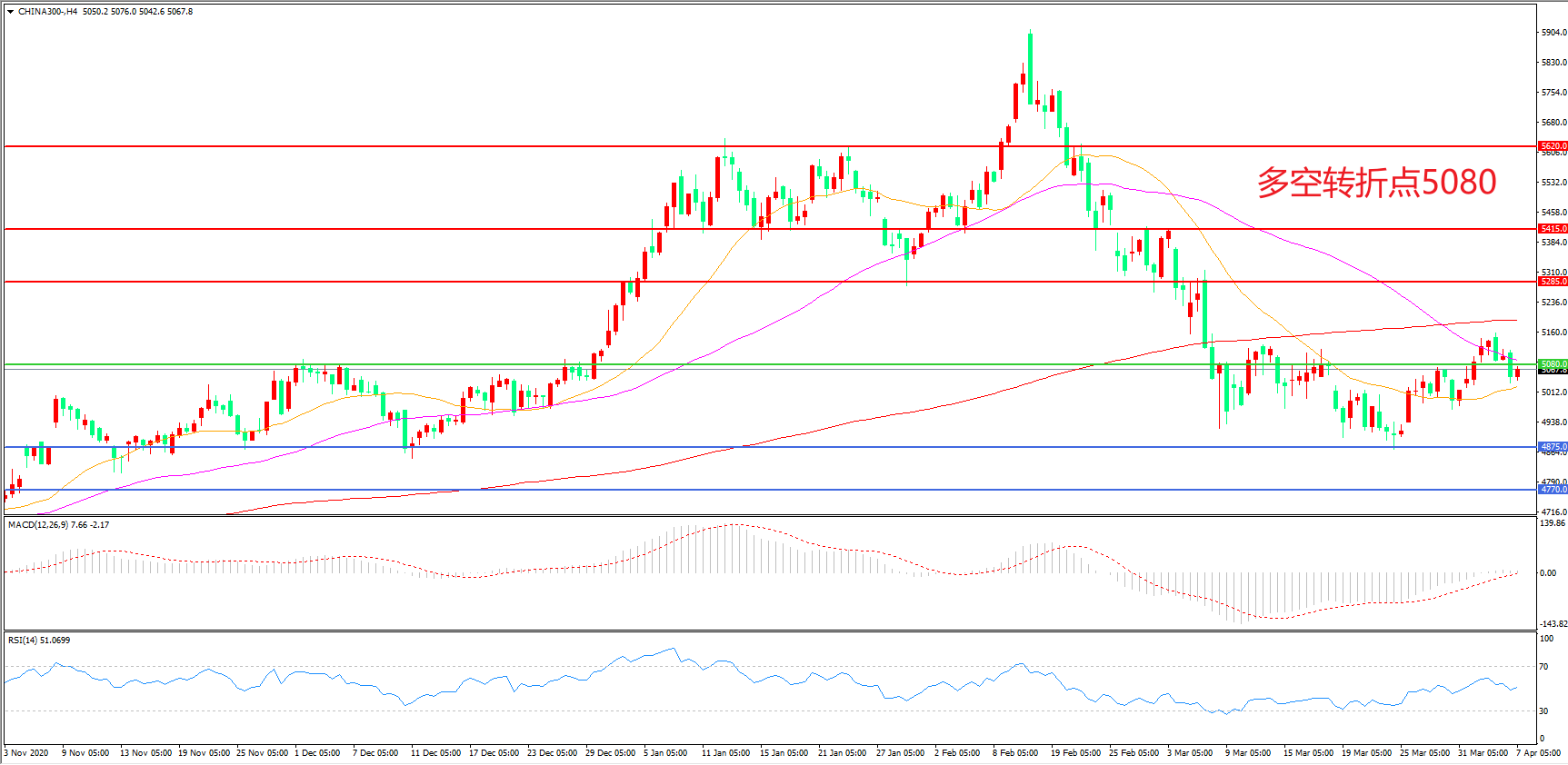 4小时图看,沪深300冲高回落,短期走势有所企稳,5080成为多空分水岭,21周期均线形成下方支撑,55周期均线成为上方阻力,MACD绿柱缩短,RSI指标向上,日内震荡上行概率较大。