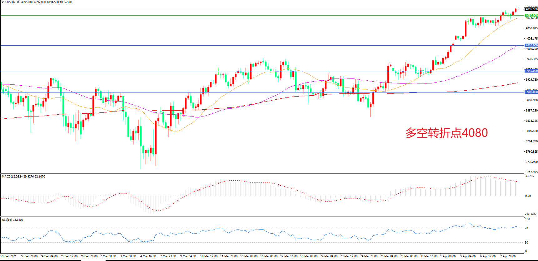 周四(4月8日),虽然美国首次申请失业救济人数意外不降反增,但美联储再次释放宽松信号,美联储主席鲍威尔重申联储保持支持经济,联储有工具应对高通胀,科技股带头走高,大型科技股中,苹果涨逾1.9%,微软、奈飞涨超1%,标普500大幅拉升,收报4095.25点。目前美股持续刷新记录,其背后的核心原因仍在于美国当前处于近零利率环境,加之拜登刺激计划中美元持续注入,上市企业可以发债回购继续推升股价。