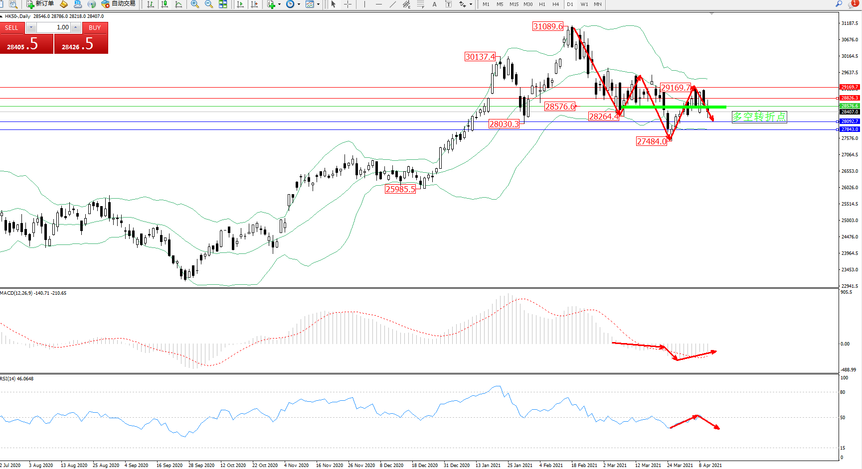 技术点评:空头动力延续布林带指标通道中下轨区间持续震荡下行,低位抵达27484位置节点后得到回升,高位29169位置后遇阻反转下行,触及中轨附近节点后开始持续震荡,有继续下行迹象,布林带指标呈收口走势后开始平移,MACD指标处于0轴线下方空头区域维持整理平移中,RSI指标处于50均衡线附近弱势徘徊后有下移迹象;